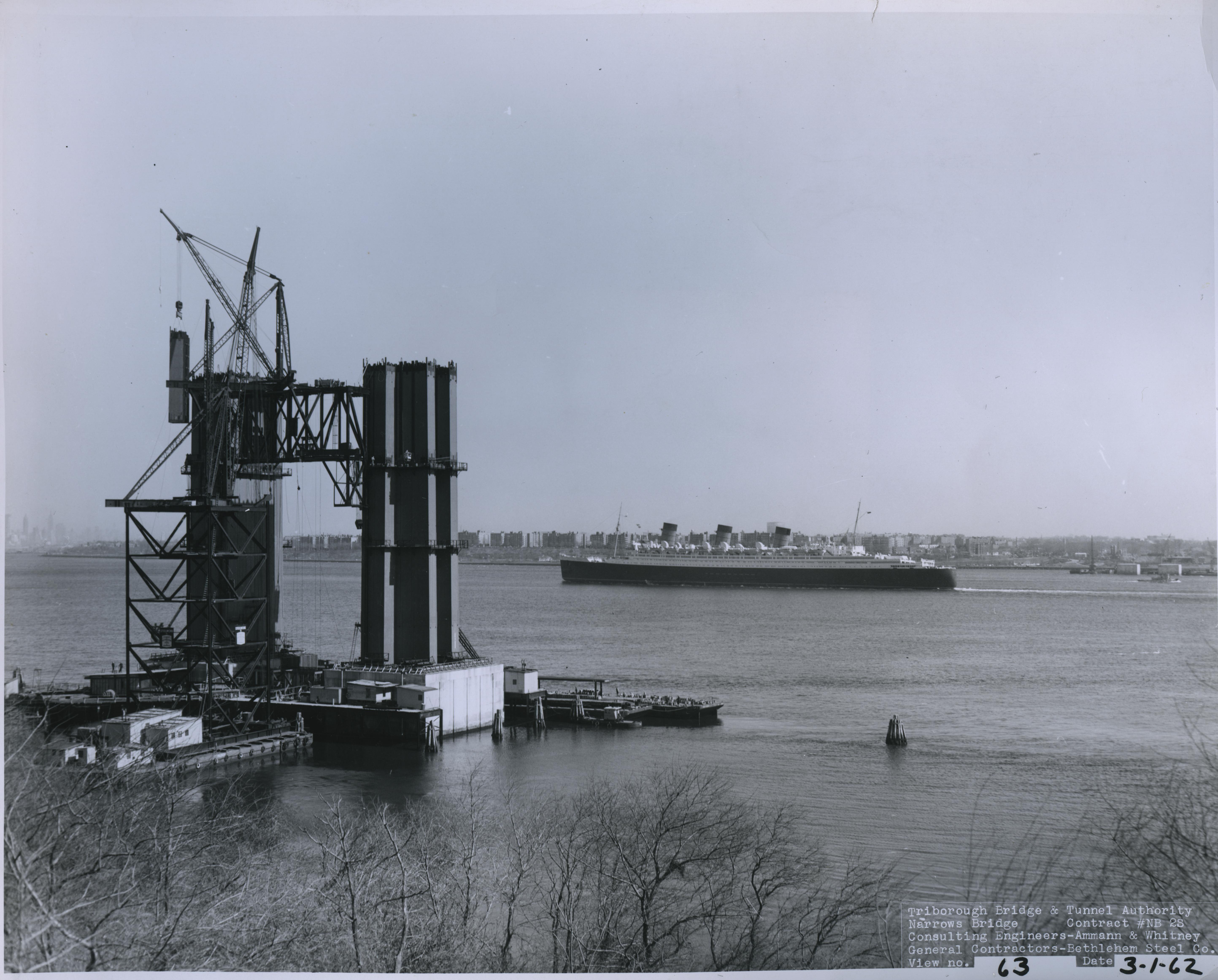 방수 케이슨이 해안선 가까이 운하에 침몰되었고, 스태튼아일랜드 쪽 케이슨은 1961년 3월에 침몰되었다.[88] 1962년 스태튼아일랜드 쪽 타워가 꼭대기에 도달했고,[93] 브루클린 타워 건설이 시작되었다.[94]