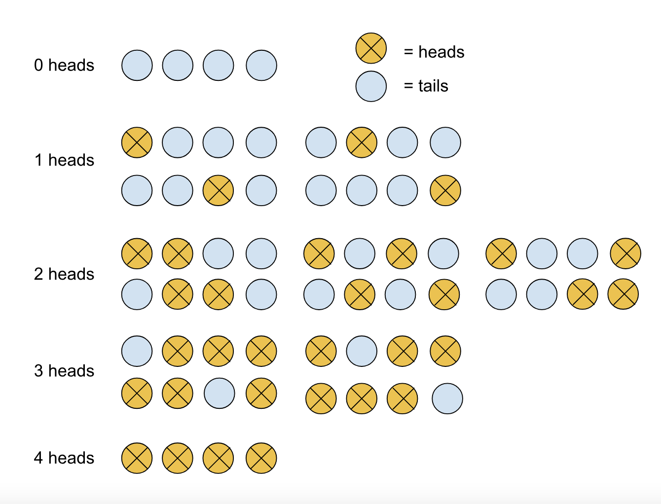 공정한 동전을 네 번 던지는 간단한 실험에서 정확히 두 번 앞면이 나올 확률을 구하는 예시이다.