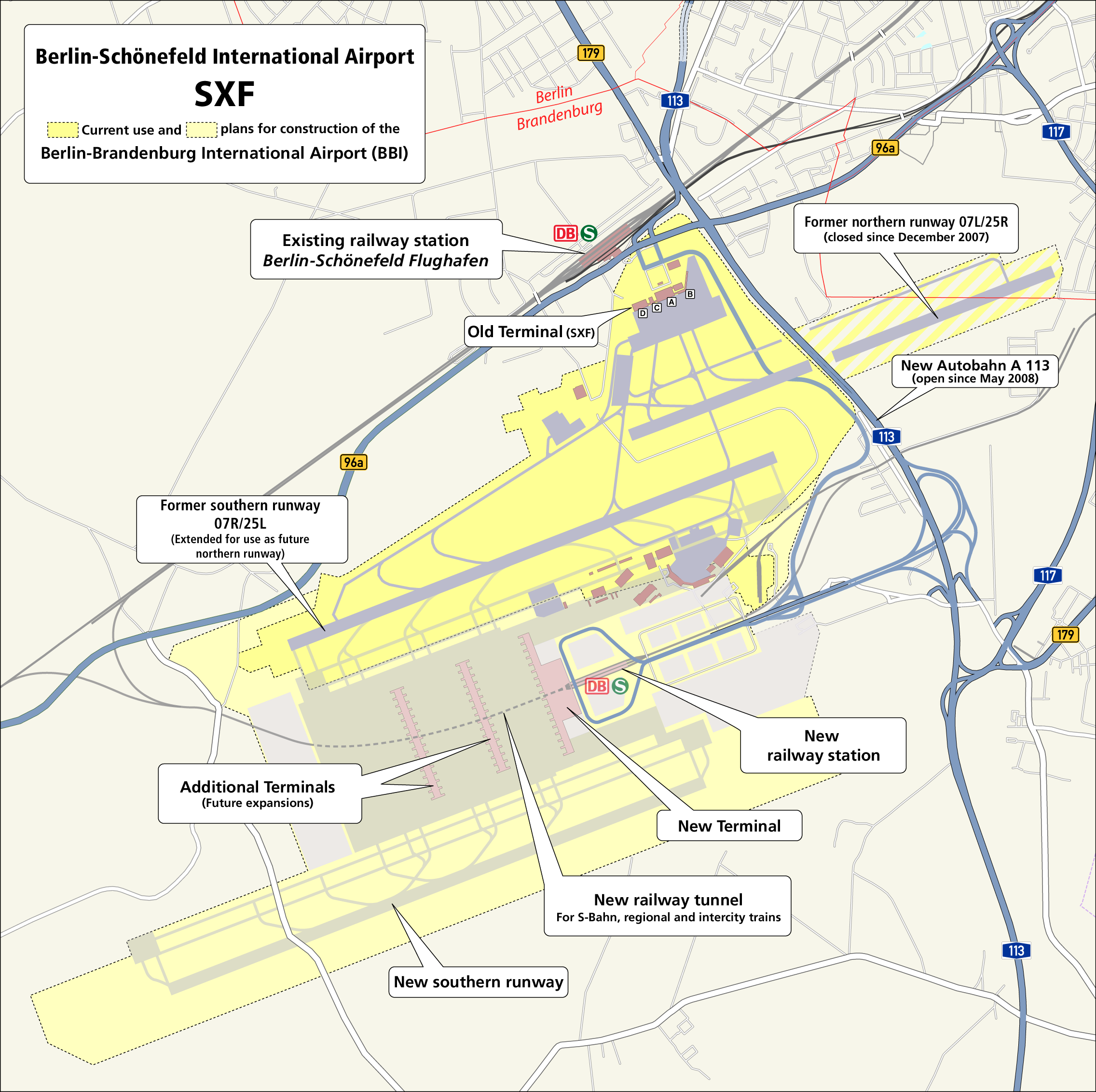 과거 베를린 쇠네펠트 공항의 북쪽 활주로는 2007년 12월에 폐쇄되었고, 2008년 5월에 아우토반 A113호선이 이를 가로질러 연결되었다.[554] 쇠네펠트 공항의 남쪽 활주로는 2007년 10월에 ICAO 권고안에 맞추어 3,000m에서 3,600m로 개선·연장되었으며,[555] 2012년 4월 23일에 완공되어 2012년 5월 3일에 베를린 브란덴부르크 공항의 북쪽 활주로(07L/25R)로 개명되었다.