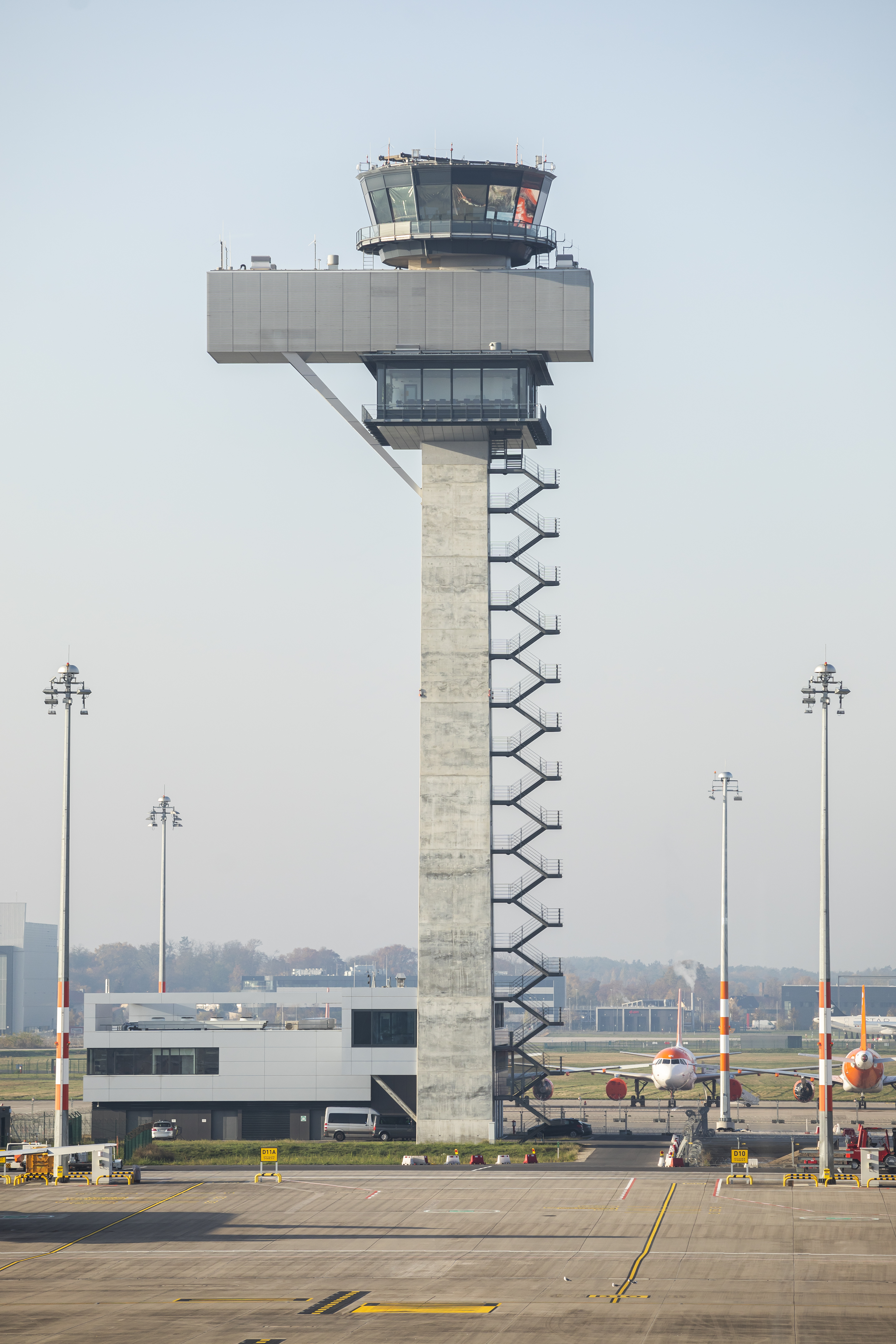 독일 항공 교통 관제(Deutsche Flugsicherung)에서 항공 교통 관제를 담당한다.[561][114] 관제탑 높이는 72m로, 독일에서 뮌헨 공항, 뒤셀도르프 공항에 이어 세 번째로 높다.[561][114] 관제탑에는 독일 항공 교통 관제 사무실, 휴게실, 회의실 등이 설치되어 있으며, 독일 최초로 주기장 관제(apron control)를 같은 관제탑에서 실시한다.[561] 새 관제탑은 2012년 3월 초부터 시험 운영을 시작하여 2012년 3월 24일에서 25일로 넘어가는 밤에 정식 운영을 시작했다.[561] 베를린 브란덴부르크 공항 이전까지는 관제탑에서 쇠네펠트 공항의 관제도 담당했다.[561] 2018년 3월 16일에는 기술 관리(전원 공급 및 IT)가 가동되었다.[115]