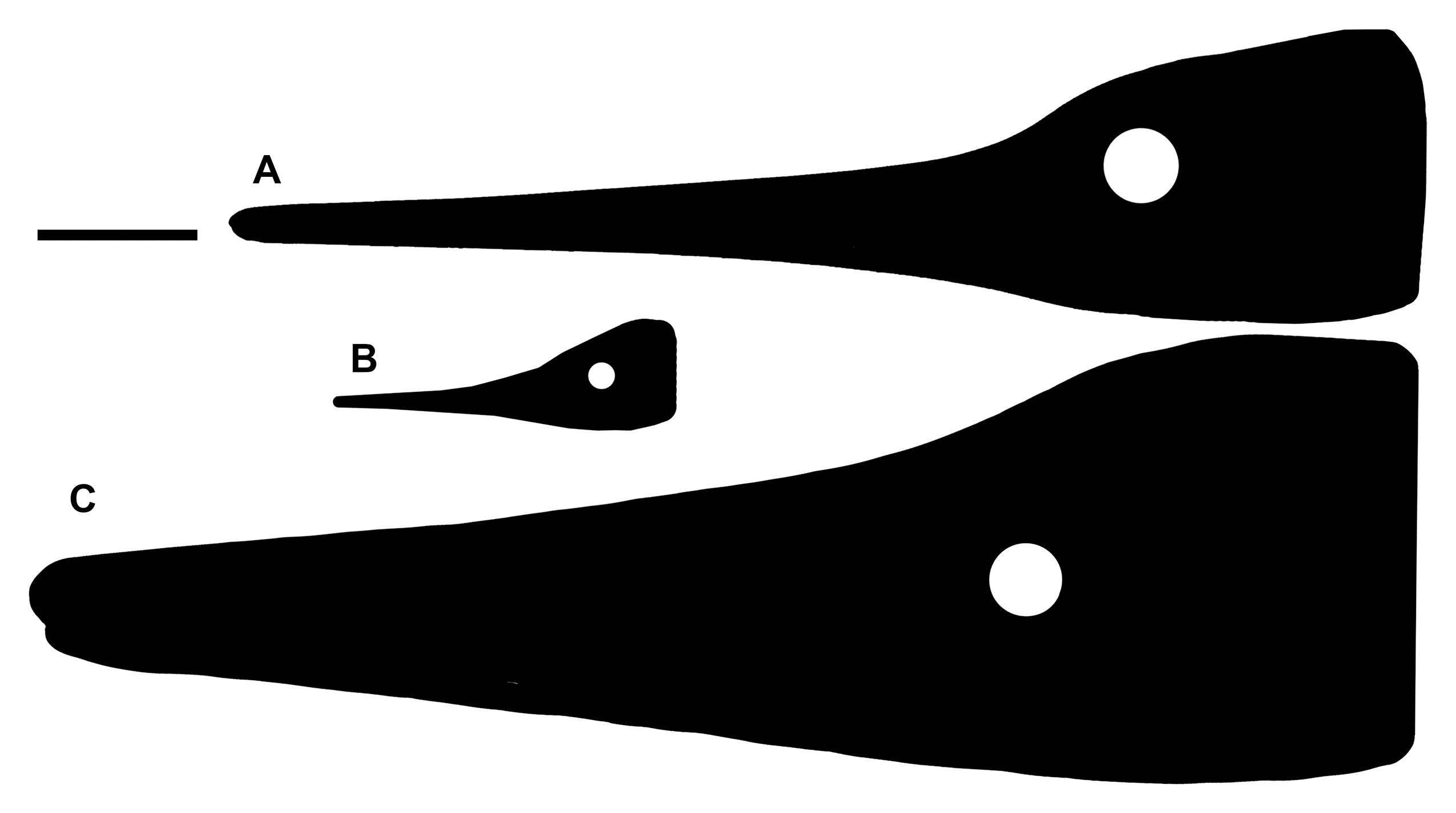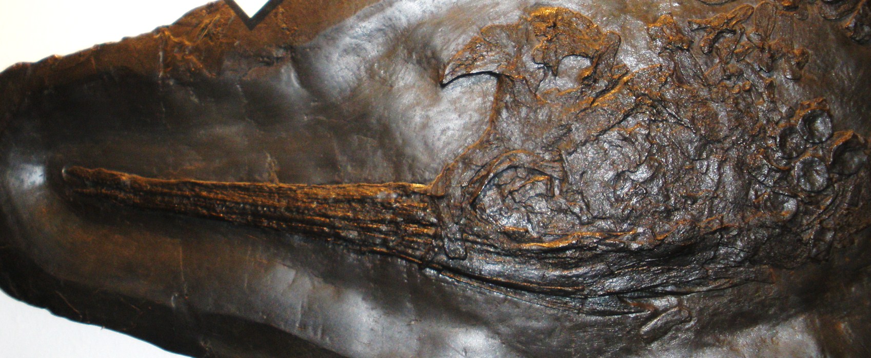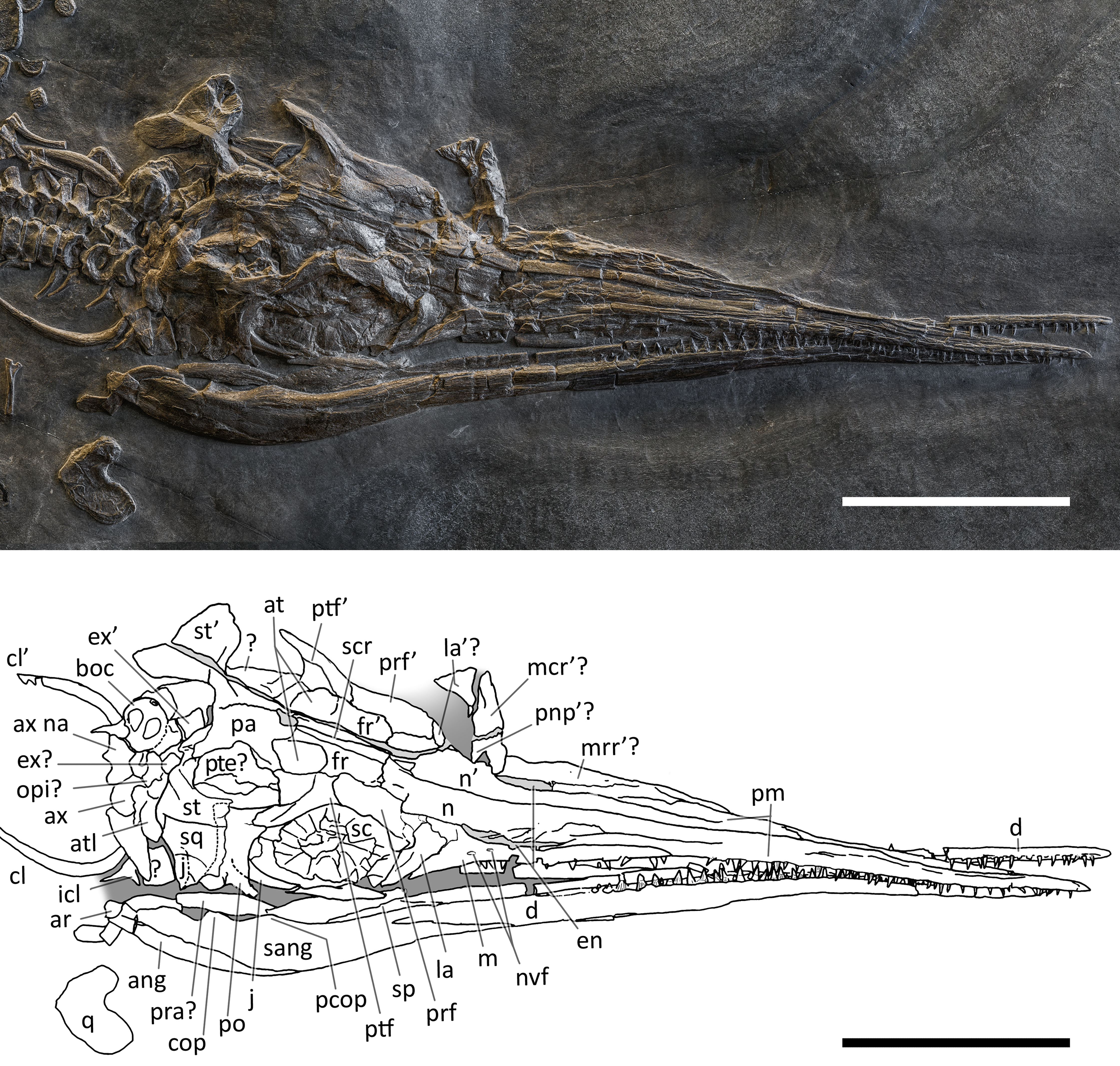 주둥이의 대부분은 이빨이 있는 긴 전상악골로 이루어져 있다. 전상악골의 앞쪽 끝은 뭉툭하며, 뒤쪽 끝은 갈라져서 외부 콧구멍 위아래로 뻗어 있다. 외부 콧구멍은 생존 시 틈새 모양이었을 것으로 보이며,[6] 그 뒤쪽 경계는 전상악골 뒤에 위치한 가늘고 세 갈래로 갈라진 상악골의 위쪽 돌출부에 의해 형성된다.[6] 초기 연구에서는 비골이 콧구멍 경계에 관여하지 않는 것으로 보았으나,[1] 추가 표본 연구를 통해 주둥이 위쪽을 따라 뻗은 비골이 외부 콧구멍의 위쪽 뒤쪽 모서리를 형성한다는 것이 밝혀졌다. 또한 누골도 콧구멍 경계의 일부를 이룬다.[6]