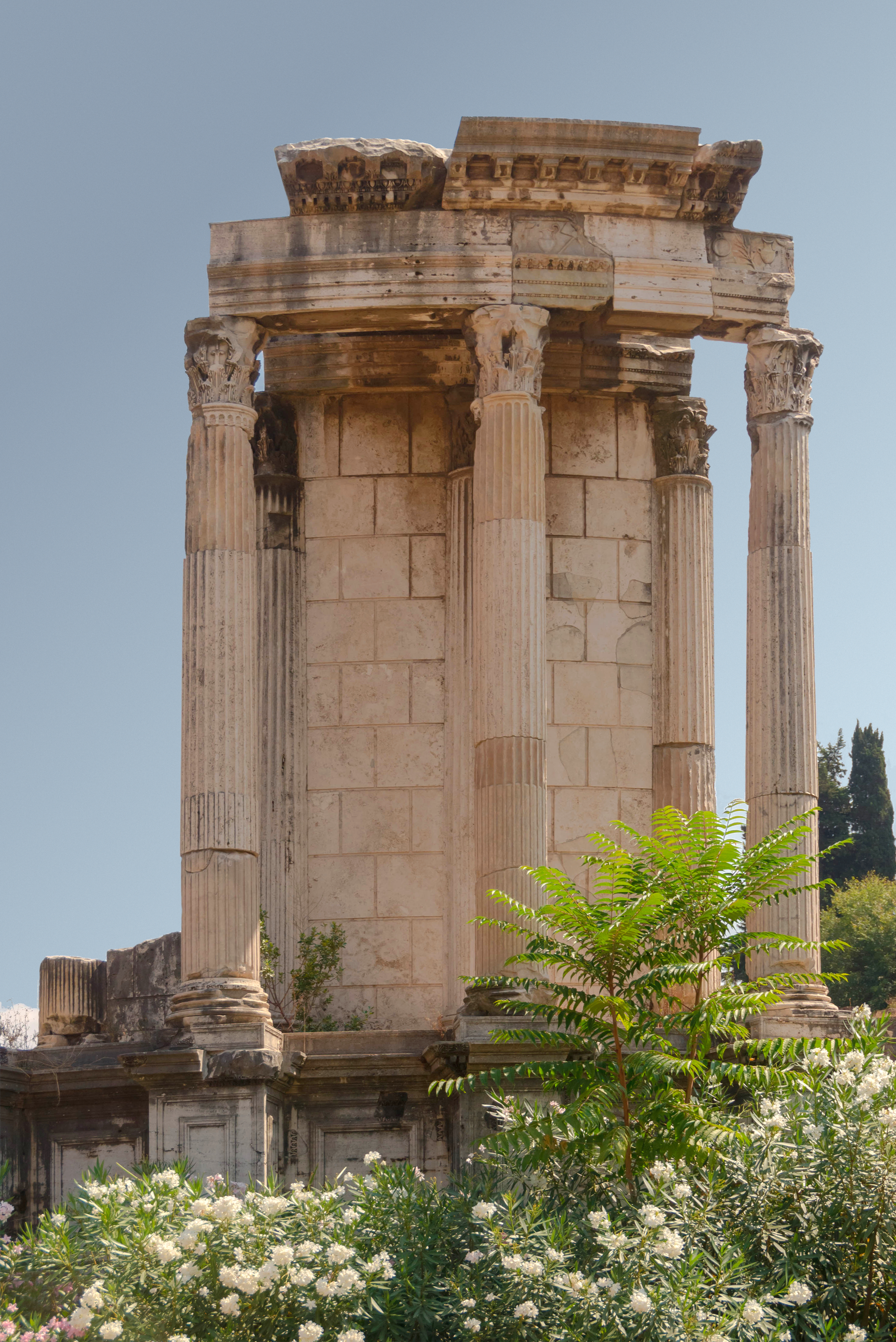 베스타 신전은 로마 포룸에서 가장 초기에 세워진 건축물 중 하나였지만, 최종 형태는 이후의 재건축을 통해 완성되었다.[10] 원래의 베스타 신전은 포룸의 동쪽 끝, 베스타 여사제의 집과 레기아 근처에 위치해 있었다. 이 건물들 너머에는 위로 뻗어 올라가는 비아 사크라(성스러운 길)가 있었다.[11] 이 건물들은 서기 64년 로마 대화재로 파괴되었으며, 신전은 트라야누스 황제에 의해 수년에 걸쳐 재건되었다.[2]2. 5. 재건 역사