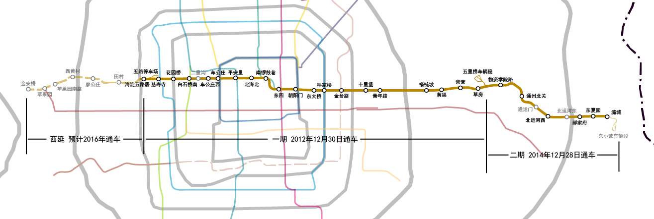 2012년 12월 30일 하이뎬우루쥐역에서 차오팡역 구간이 먼저 개통되었고, 2014년 12월 28일 차오팡역에서 루청역 구간이 개통되었다.[38]2018년 12월 30일 진안차오역에서 하이뎬우루주역 구간과 베이윈허둥역이 개통되었으나, 핑궈위안역은 개통되지 않고 열차가 통과했다. 2021년 12월 31일 핑궈위안역 6호선 승강장이 개통되었고, 2023년 3월 18일 얼리거우역이 개통되었다.[39]