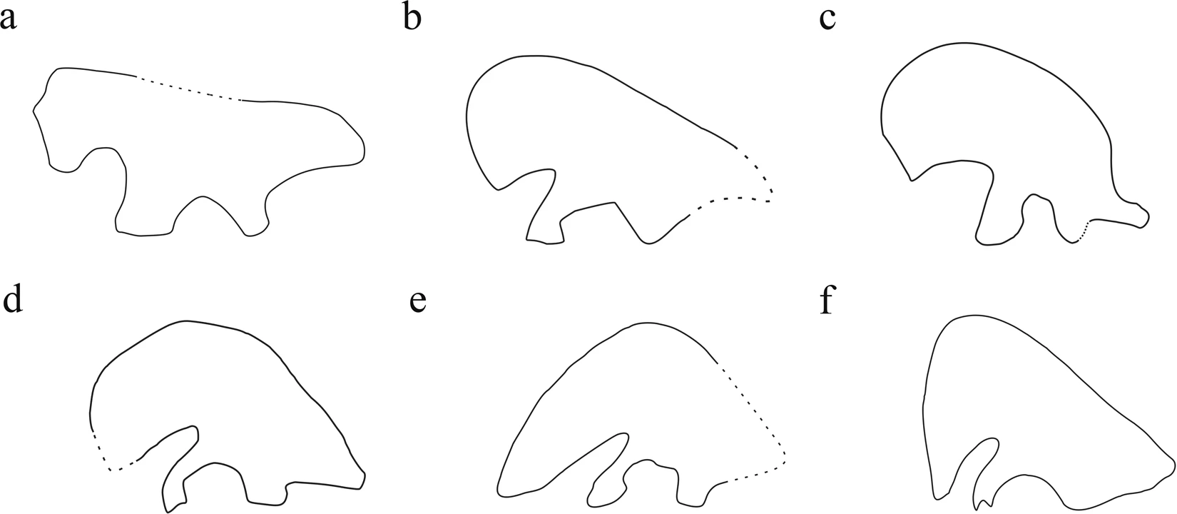 - 좌골의 앞쪽 가장자리에서 돌출된 폐쇄공 돌기는 팁이 아래쪽으로 구부러진 물결 모양의 윤곽을 가지고 있다.