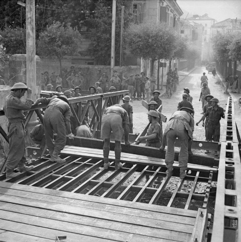 영국 공병대가 이탈리아에서 베일리교를 조립하고 있는 모습. 거더에 나무판을 깔고 있다.(1943년 9월)