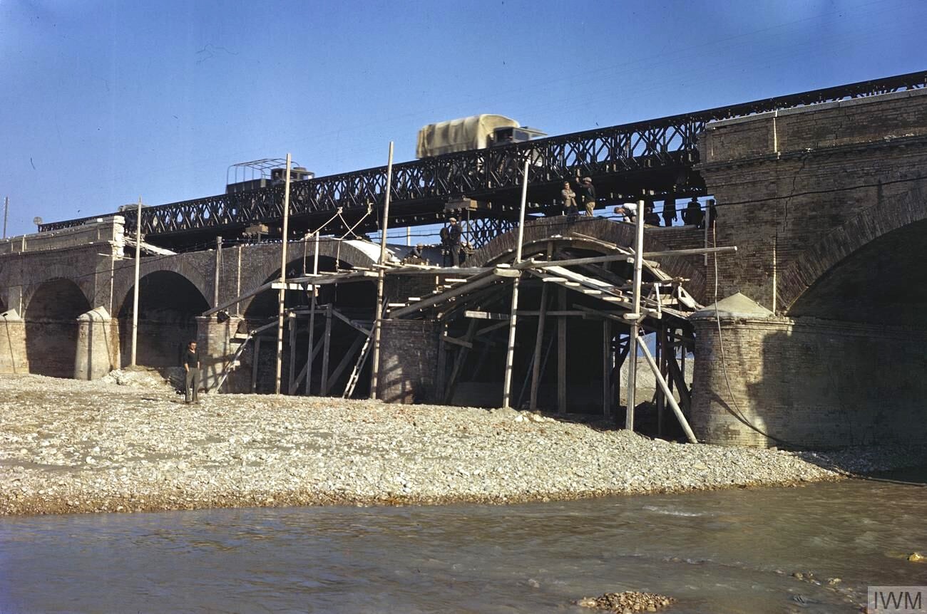 연합군 차량들이 베일리교를 건너고 있다. 베일리교는 손상된 석조 아치교 구간에 걸쳐 설치되었으며, 동시에 지역 노동자들이 원래 다리를 재건하고 있다. 이탈리아 1944년