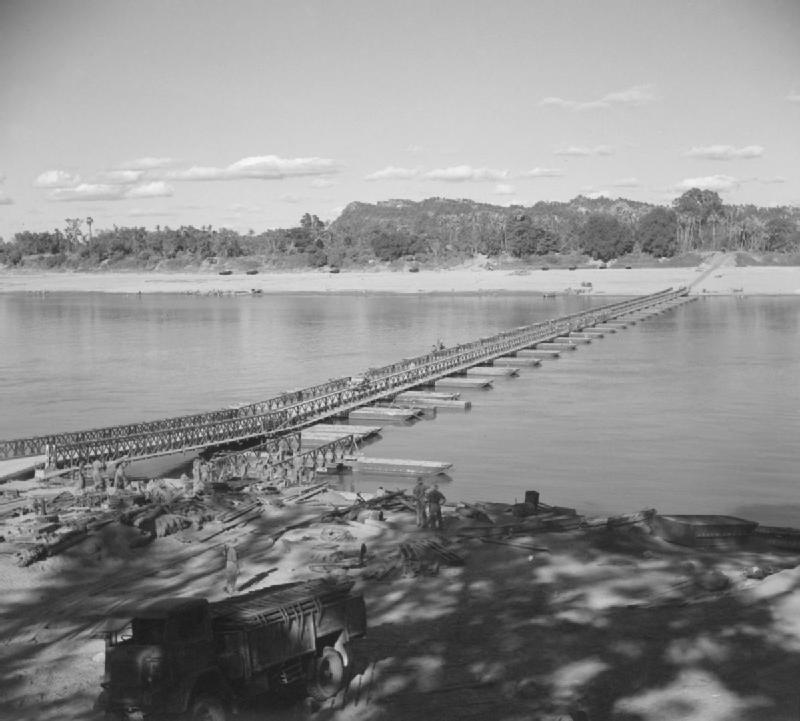 윌리엄 슬림 장군이 버마의 친드윈강에 교두보를 설치하도록 제11사단에 명령한 것은 1944년 12월 3일부터 4일 밤에 걸쳐 일어난 일이었다. 이를 받아 공병대는 12월 10일에 베일리 교를 완성했다. 길이는 352m로, 당시 세계 최장의 베일리 교가 되었다. 폰툰이 설치되었으며, 베일리 교 자체는 '''28시간 연속 조립으로 설치'''되었다고 한다. 그 동안 일본의 제로센에 의한 공격이 있었지만, 대공포화로 2기를 격추하며 구축했다.[43]