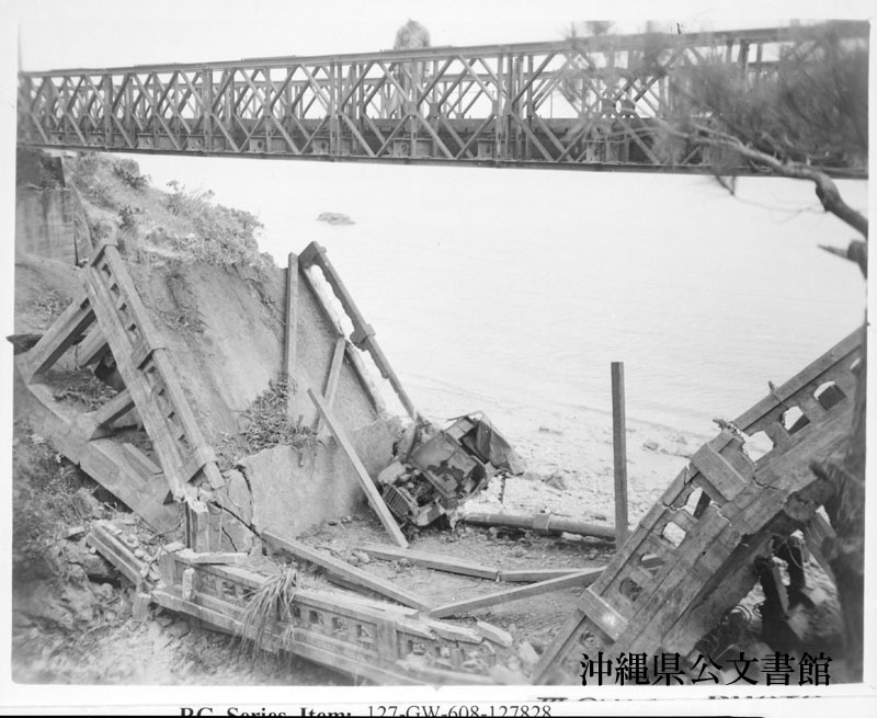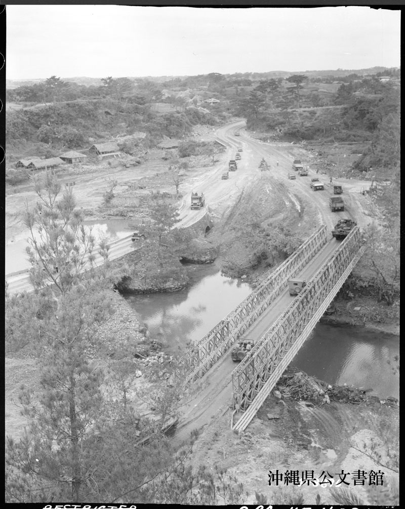 해병대 기록 "일본군 파괴 부대가 파괴한 콘크리트 다리 자리에 세워진 대형 베일리교" (1945년 4월 21일) - 오키나와현 공문서관 소장