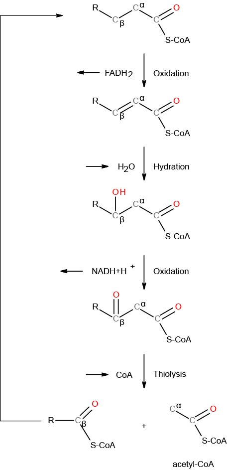 미토콘드리아에 들어온 짝수 포화 지방산은 다음과 같이 4단계의 베타 산화를 반복하면서 한 번에 탄소 두 개 단위(아세틸-CoA)로 방출한다.