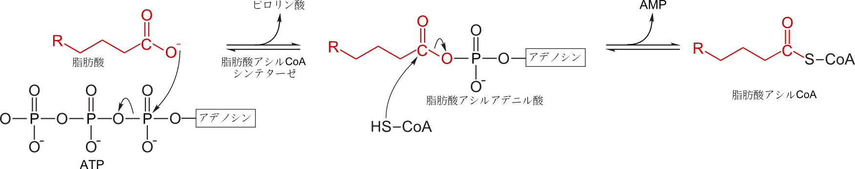 아실-CoA 합성효소는 지방산 티오키나아제 (fatty acid thiokinase)라고도 불린다. 이 반응은 두 단계로 일어난다. 먼저 지방산의 카르복실산 이온이 ATP인산 (β, γ 인산)과 치환되어 지방산 아실 아데닐산 (fatty acyl adenylate)과 피로인산 (PPi)이 생성된다. 다음으로 보조 효소 A의 티올기가 아실기의 탄소를 친핵성 공격하여 지방산 아실 CoA와 AMP를 생성한다. 생성된 지방산 아실 CoA는 미토콘드리아 안쪽막으로 운반되어 β 산화를 받거나 세포질에서의 막 지질 합성에 이용된다.