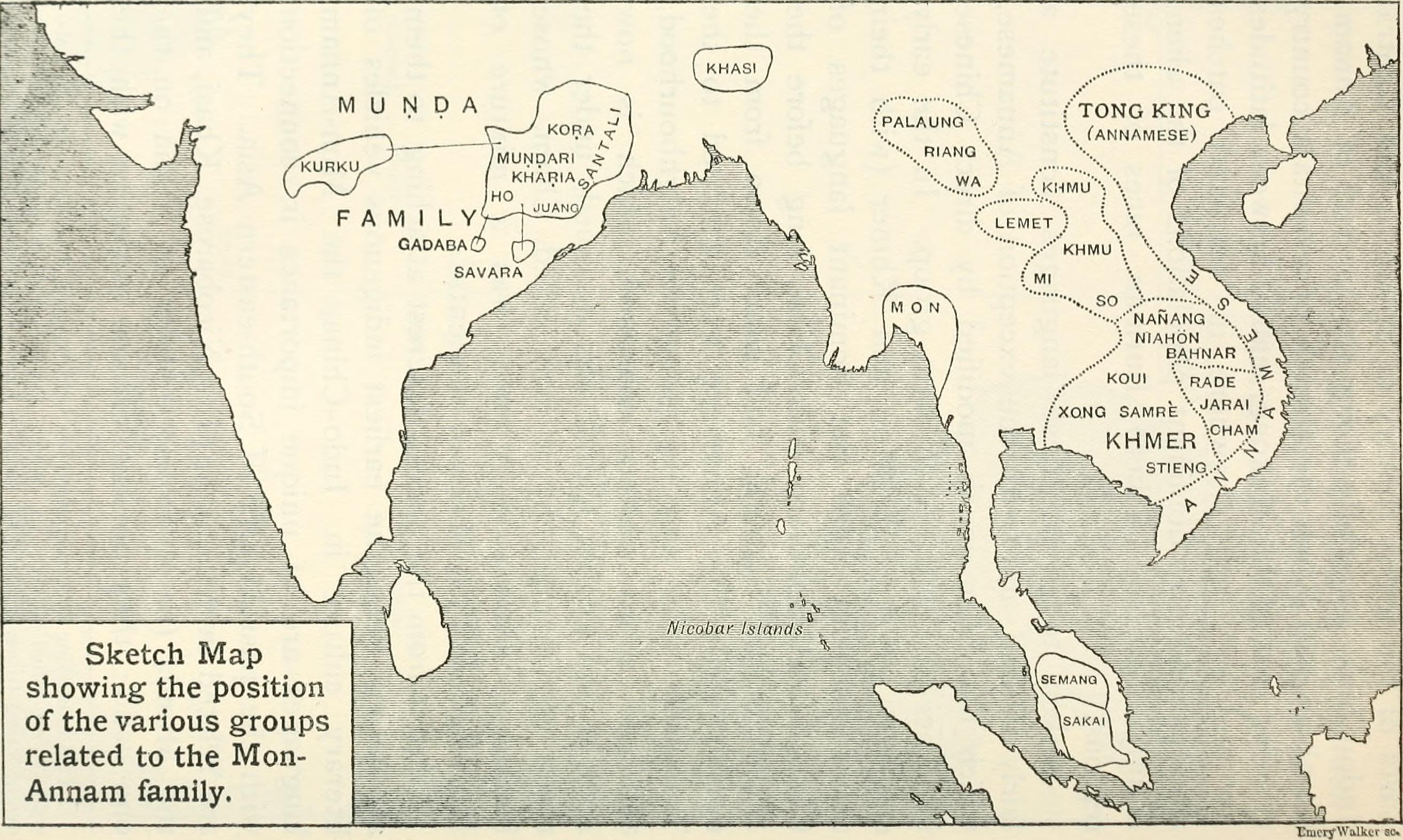 영국 언어학자 월터 스키트와 찰스 블래그든이 1906년에 분석한 오스트로아시아어족(이전에는 몬-안남어족으로 알려짐) 지도. 베트남어는 안남어로 표시됨.