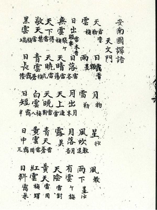 한자음의 대응은 중국어 각 방언, 일본어, 한국어에서 거의 변화가 없거나 (변화하더라도 b와 같은 순음으로 남는) 초성 자 "面", "民" 등이 d(북부 방언의 )로 변화하고, 반모음 초성 자도 마찰이 강해져 d(북부 방언의 )가 된다. 또한, 의 일부는 로 변화하는 것이 특징적이며, 현대 중국어의 sh() 초성 자의 일부는 th()에 대응한다.[69]