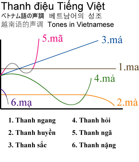 각 베트남어 음절은 여섯 가지 고유한 성조 중 하나로 발음되며, 주요 모음 또는 모음 그룹을 중심으로 한다. 성조는 다음과 같은 점에서 다르다.
