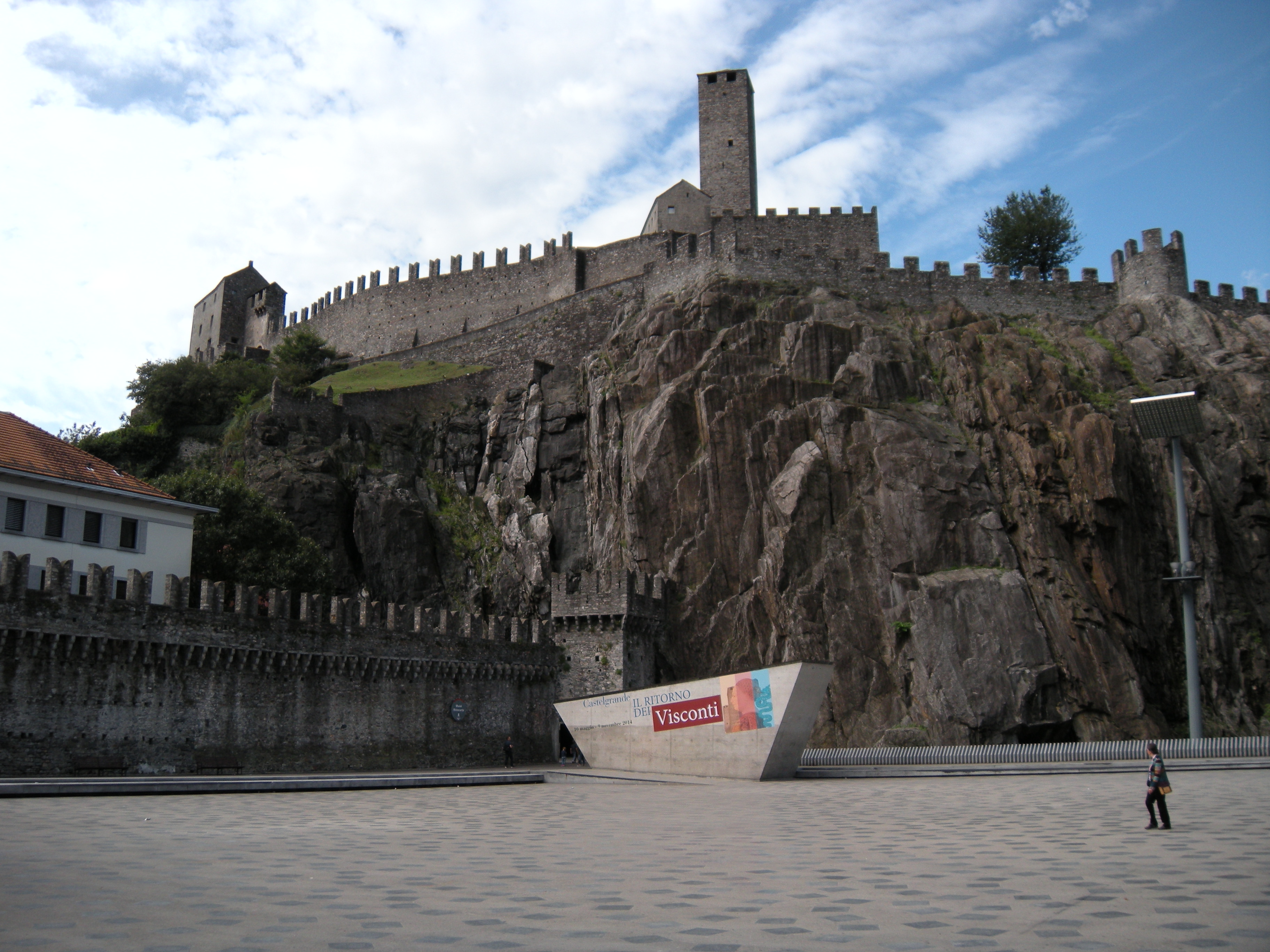카스텔그란데는 10세기에서 11세기에 걸쳐 최초로 강화되었다. 그 성에 더하여 13세기에는 도시의 동쪽에 있는 바위가 많은 돌출부에 몬테벨로 성이 세워져 도시의 요새화에 기여했다. 또한 1400년경에 도시의 고지대에 새로운 탑이 세워졌으며, 그것이 후에 사소 콜바로 성의 중심부가 되었다. 또한 알프스 남부의 이탈리아와의 국경선을 형성하는 성벽도 건설되었다.[4]