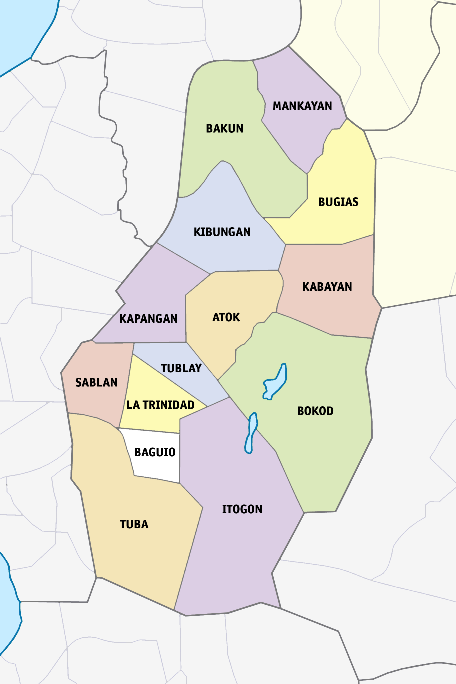 고도로 도시화된 도시인 바기오는 벵게트주와 행정적으로 독립되어 있지만, 라 트리니다드, 이토곤, 사블란 및 투바 지방 자치체로 둘러싸여 있다.
