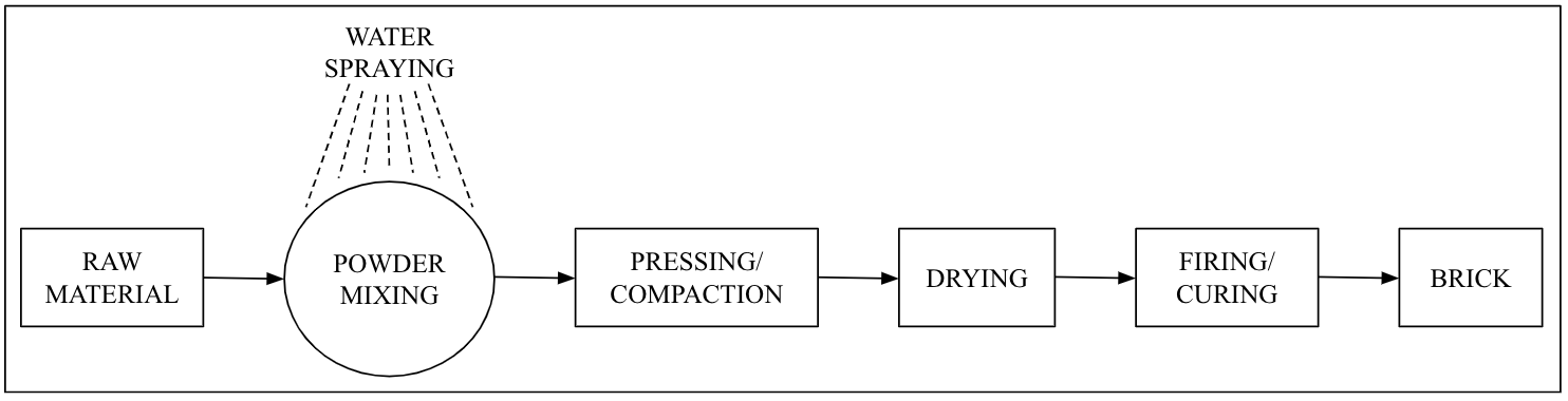 - '''성형 벽돌:''' 원료 점토(수축을 줄이기 위해 모래를 25~30% 혼합하는 것이 좋음)를 분쇄하고 물과 혼합하여 유압 프레스로 강철 금형에 압축한다. 성형된 점토는 에서 굽는다.