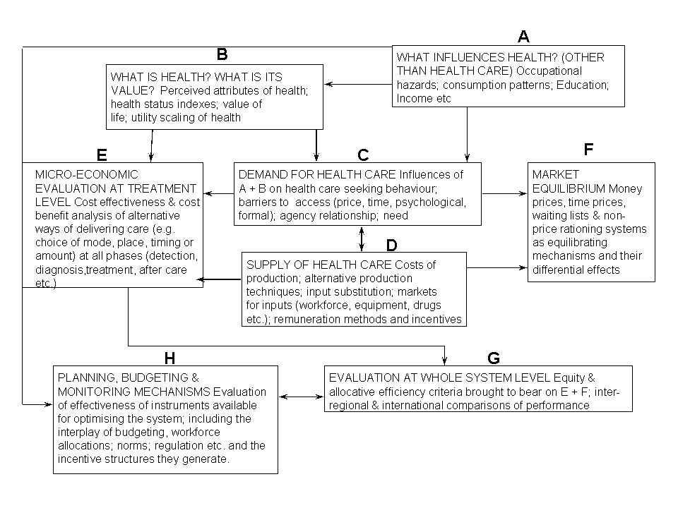 앨런 윌리엄스는 보건경제학을 8가지 주요 주제로 구분했다.[10]- 건강에 영향을 미치는 비의료적 요인 (예: 소득, 교육, 환경)