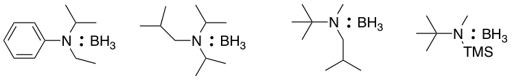 유기포스핀과 보레인의 부가물인 포스핀-보레인(R3−nHnPBH3)보다 아민과 보레인의 부가물이 더 널리 사용된다.[18] 보레인은 트리에틸아민과 강한 부가물을 형성하는데, 이 부가물을 사용하면 하이드로보론화 반응에서 더 가혹한 조건이 필요하다. 이는 트리엔을 중합을 피하기 위해 하이드로보론화하는 경우와 같이 유리할 수 있다. 입체적으로 더 큰 삼차 및 실릴 아민은 실온에서 알켄에 보레인을 전달할 수 있다.
