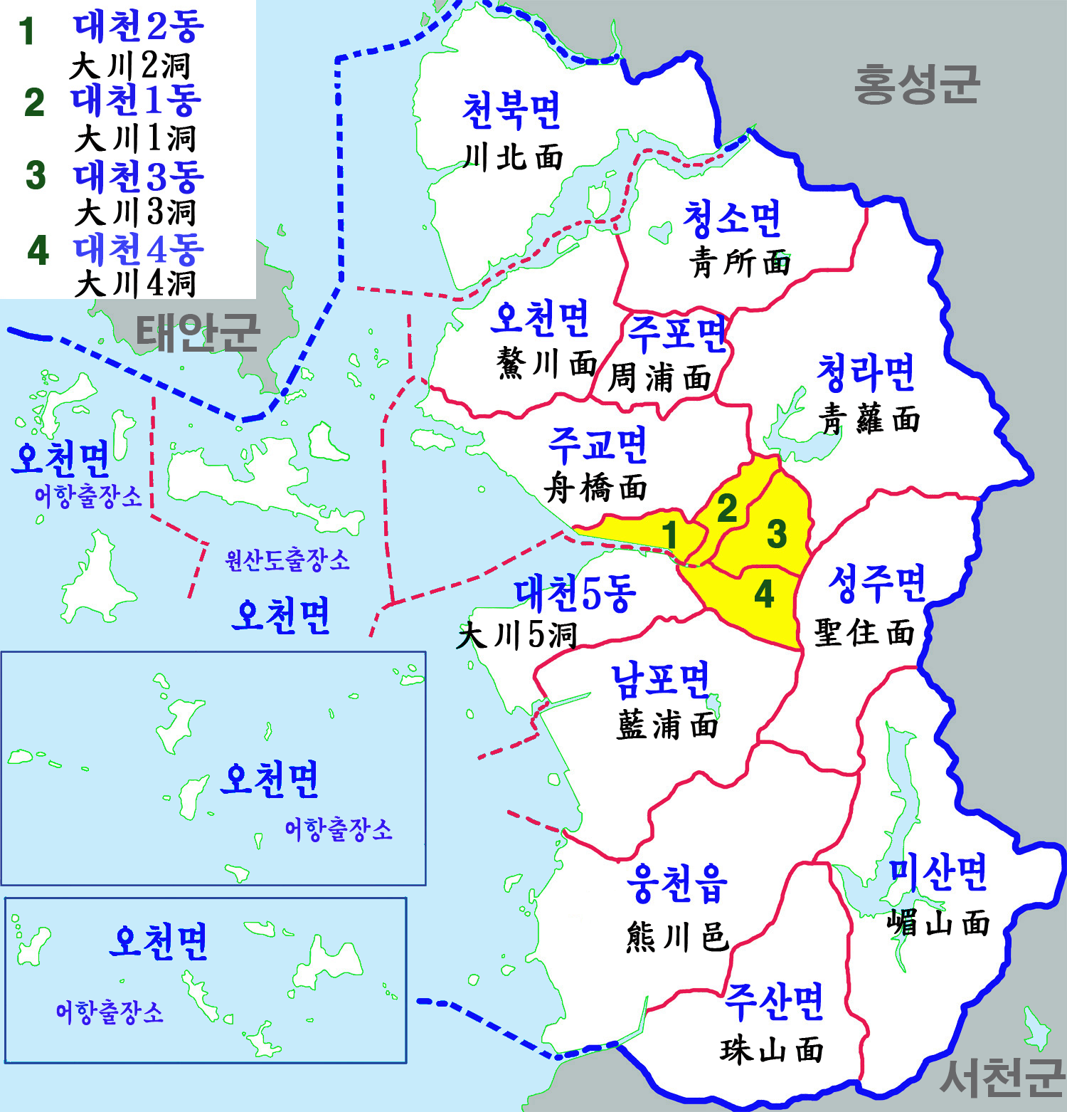 오천면은 조선 시대 충청수군절도사영이 있던 곳으로, 현재는 대한민국 보령시에 속하며 육지와 여러 섬으로 이루어져 있다. - 보령시의 행정 구역 - 대천동 (보령시)