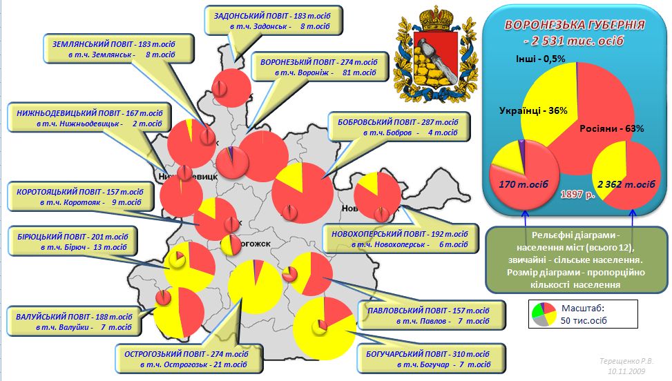 1897년 러시아 제국 인구 조사에 따르면, 보로네시현의 인구는 2,531,253명이었다. 러시아인이 63.3%로 가장 많았고, 우크라이나인이 36.1%로 그 뒤를 이었다. 그 외에 벨라루스인, 유대인, 독일인, 폴란드인, 집시 등 소수 민족도 거주했다.[10]