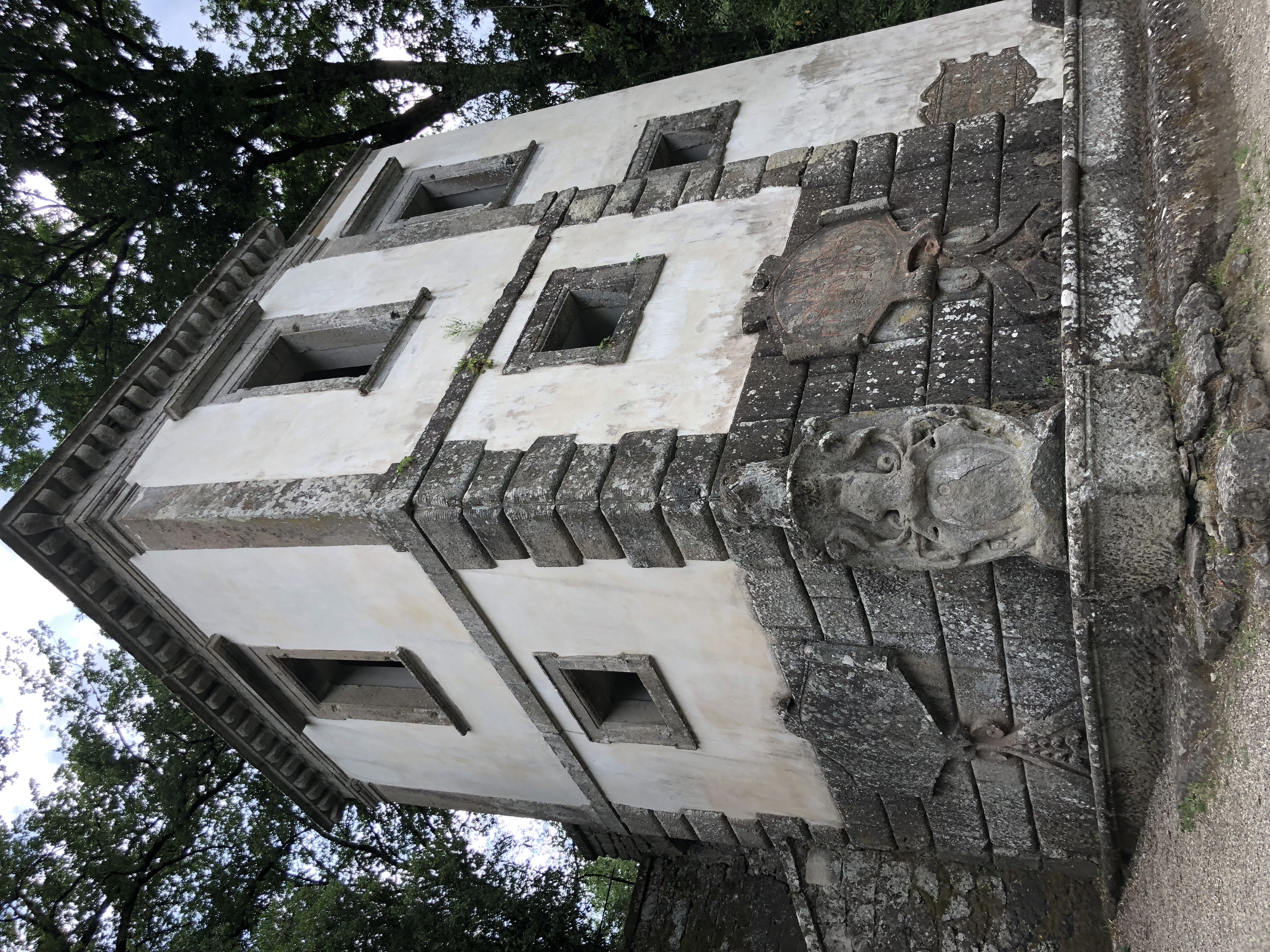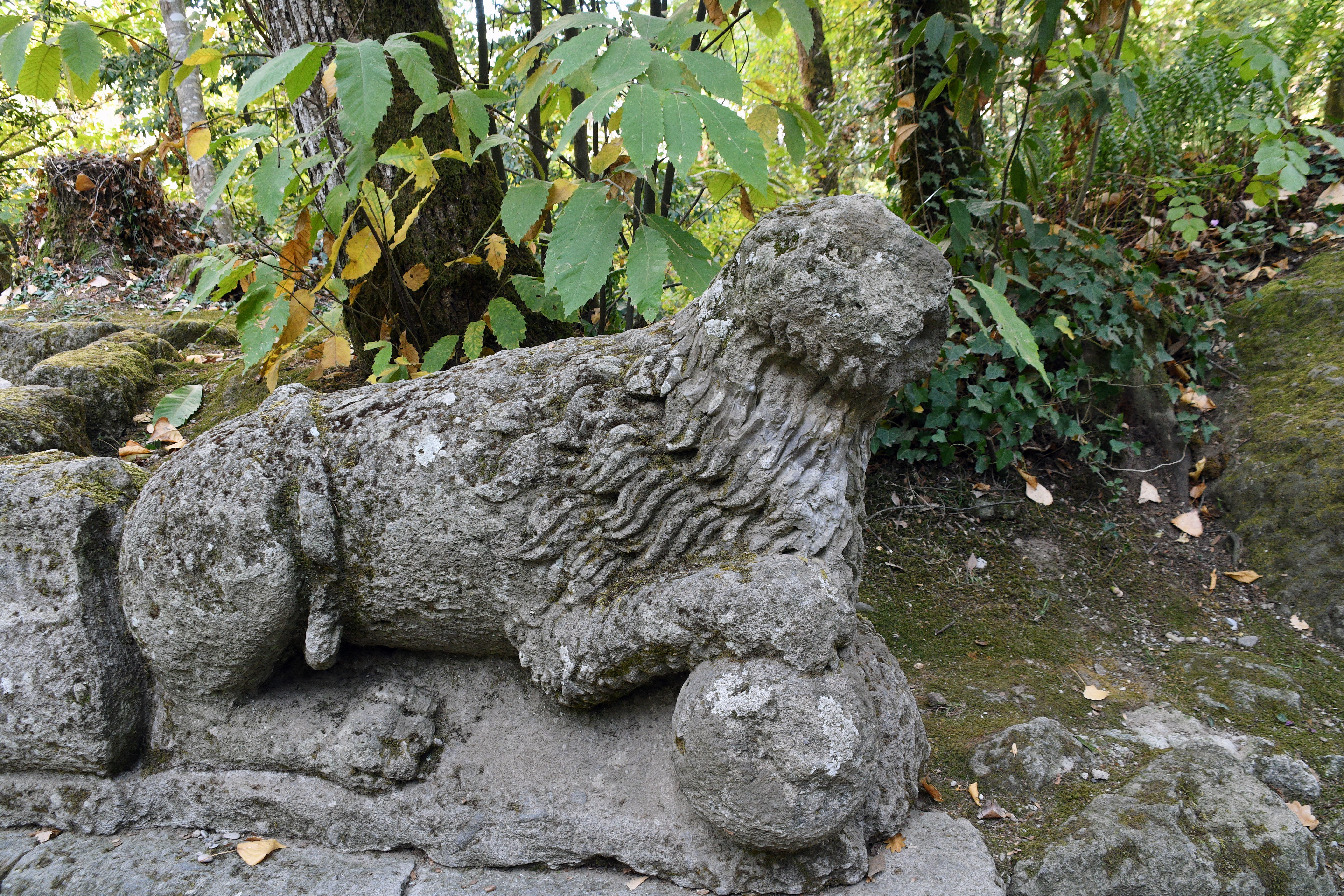 • "OGNI PENSIERO VOLA"("모든 생각은 날아간다")라고 새겨진 입술을 가진 크게 벌린 입 모양의 오르쿠스. 미술사학자 루크 모건은 이 조각상을 "지옥의 입"으로 묘사하며, 사람들이 그 안에서 식사를 했다는 점에 주목했다.[5]