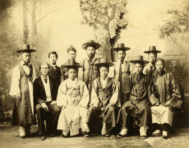 왼쪽부터, 윗줄: 현흥택, 미야오카 쓰네지로, 유길준, 최경석, 고영철, 변수.아랫줄: 퍼시벌 로웰, 홍영식, 민영익, 서광범, 우리탕.[12] (1883)||thumb||345x345px]]