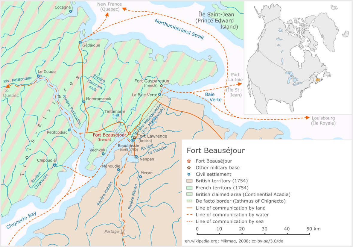 1750년대 초, 영국과 프랑스는 아카디아 지역의 전략적 요충지인 치네크토 지협(Isthmus of Chignecto)을 둘러싸고 군사적 긴장을 높여갔다. 영국이 포트 로렌스를 건설하자, 프랑스는 이에 대응하여 1751년부터 펀디 만을 조망하는 위치에 보세주르 요새를 건설하기 시작했다.[6][7] 이 요새는 오각형 모양의 보루를 갖춘 형태로 점차 완성되었으나[7][8], 1754년 부임한 사령관 루이 뒤 퐁 뒤샴봉 드 베르고르의 지휘 아래 운영되었다.[9] 결국 1755년, 7년 전쟁의 북미 전역인 프렌치 인디언 전쟁의 초기 전투 중 하나인 보세주르 요새 전투가 발발하여 영국군에게 함락되었다.[9][20]