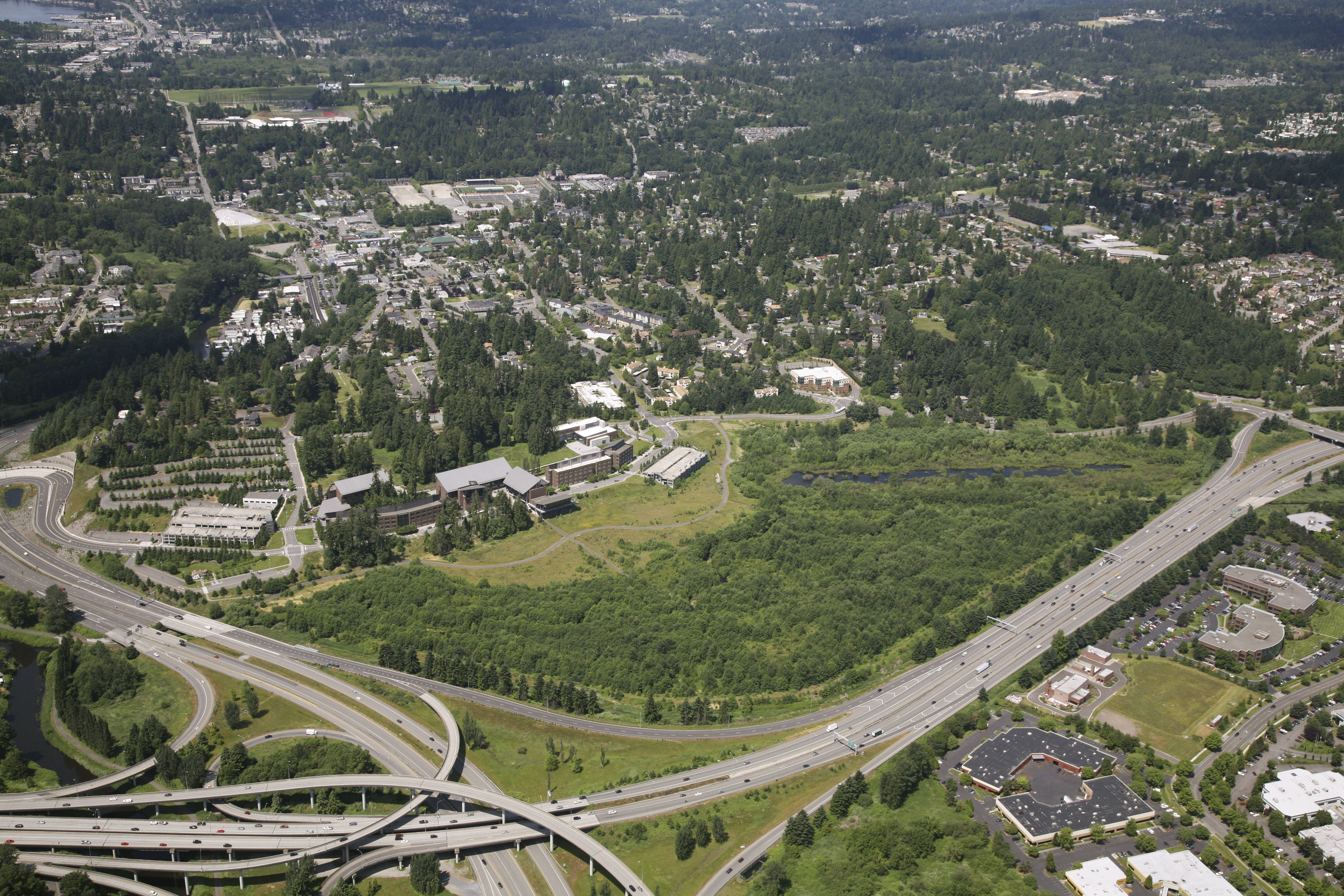 이 도시는 새매미시 강과 그 지류인 노스 크릭, 스왐프 크릭의 배수 유역에 위치하며, 일부는 워싱턴 호수로 직접 흘러 들어간다.[67] 여러 개의 습지가 있으며, 워싱턴 대학교 보텔 캠퍼스에는 복원된 노스 크릭 습지가 있다.[73][74] 도시에서 가장 높은 지점은 나이키 미사일 사일로였던 나이키 힐로, 해발 155m이다.[71][72]