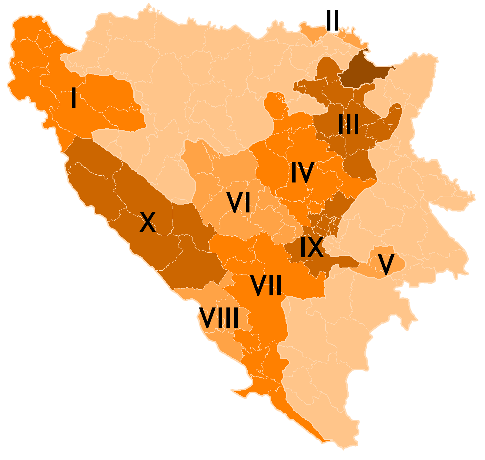 VIII | 서헤르체고비나주 | Zapadnohercegovački kanton | Zapadnohercegovačka županija | 시로키브리예그 | 81,833 | 1362.2km2 |