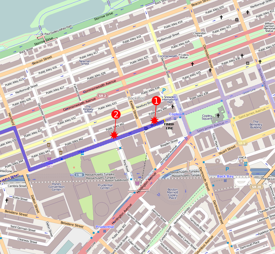 2013년 4월 15일 미 동부 시간 오후 2시 50분경, 보스턴 마라톤 결승선 직전 보일스턴 가 코플리 광장 근처에서 두 차례 폭탄이 폭발하였다.[243] 첫 번째 폭탄은 결승선 바로 앞 보일스턴 가 671번지 "마라톤 스포츠" 체인점에서, 두 번째 폭탄은 첫 번째 폭발 지점에서 약 170m 떨어진 곳에서 터졌다.[243][248][249][250][251][252][253]