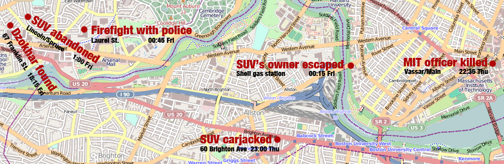 4월 18일 밤, 용의자들은 매사추세츠 공과대학교(MIT)에서 경찰관 숀 컬리어를 총격 살해하고[3] 자동차 강도질을 하여 메르세데스-벤츠 M-클래스 SUV를 훔쳤다. 이후, 형제는 뉴욕 타임스 스퀘어에 폭탄을 설치하려는 계획을 세웠다.