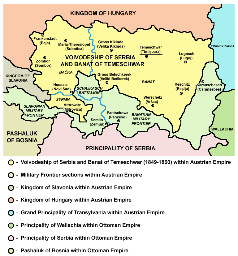 1849년, 오스트리아와 세르비아인들은 헝가리 혁명 세력을 물리쳤다. 같은 해 11월, 오스트리아 황제의 결정에 따라 헝가리 왕국 밖에 세르비아인의 보이보디나와 테메슈바르 바나트(Voivodship of Serbia and Tamiš Banat)가 설치되었다. 이 자치 영역은 바나트, 바치카, 스렘 지역으로 구성되었으며, 테메슈바르(티미쇼아라)에 수도를 두었다. 그러나 1860년, 이 공국은 폐지되고 대부분의 지역은 다시 헝가리 왕국에 편입되었다.