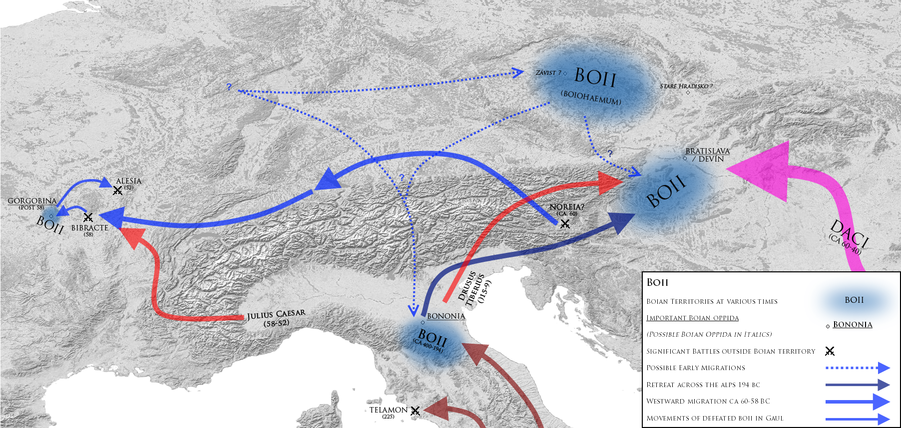 고대 작가들에 따르면, 보이족은 알프스산맥을 넘어 이탈리아 북부에 도착했다.