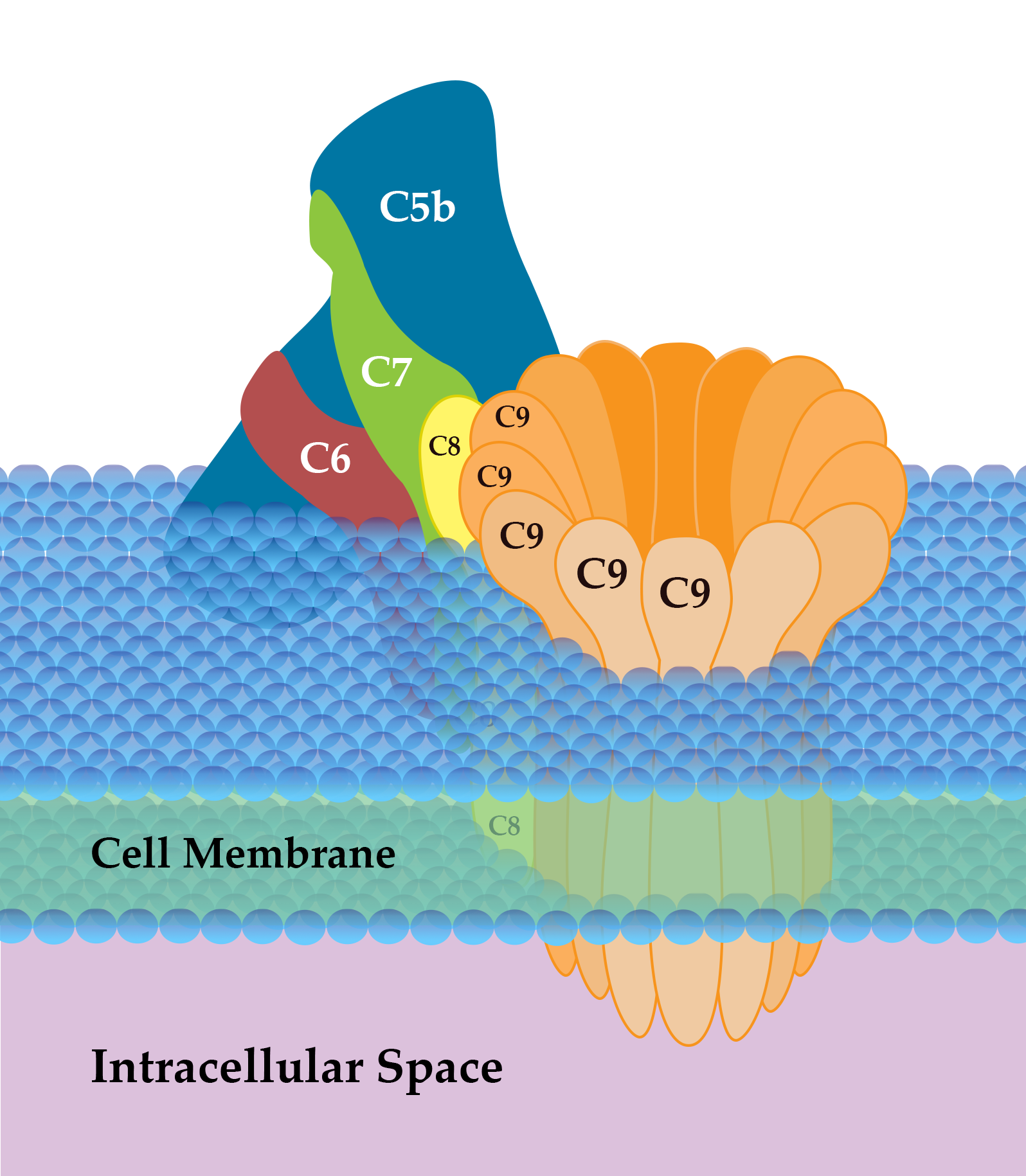 C5b 조각은 C6, C7, C8, 그리고 여러 개의 C9 분자를 순차적으로 모집하고 조립하여 최종적으로 막 공격 복합체 (MAC)를 형성한다. MAC는 병원체의 세포막에 구멍과 같은 막관통 채널을 형성하여 세포 내용물이 외부로 유출되게 함으로써 병원체를 직접 파괴(용해)시킨다.[1][14]