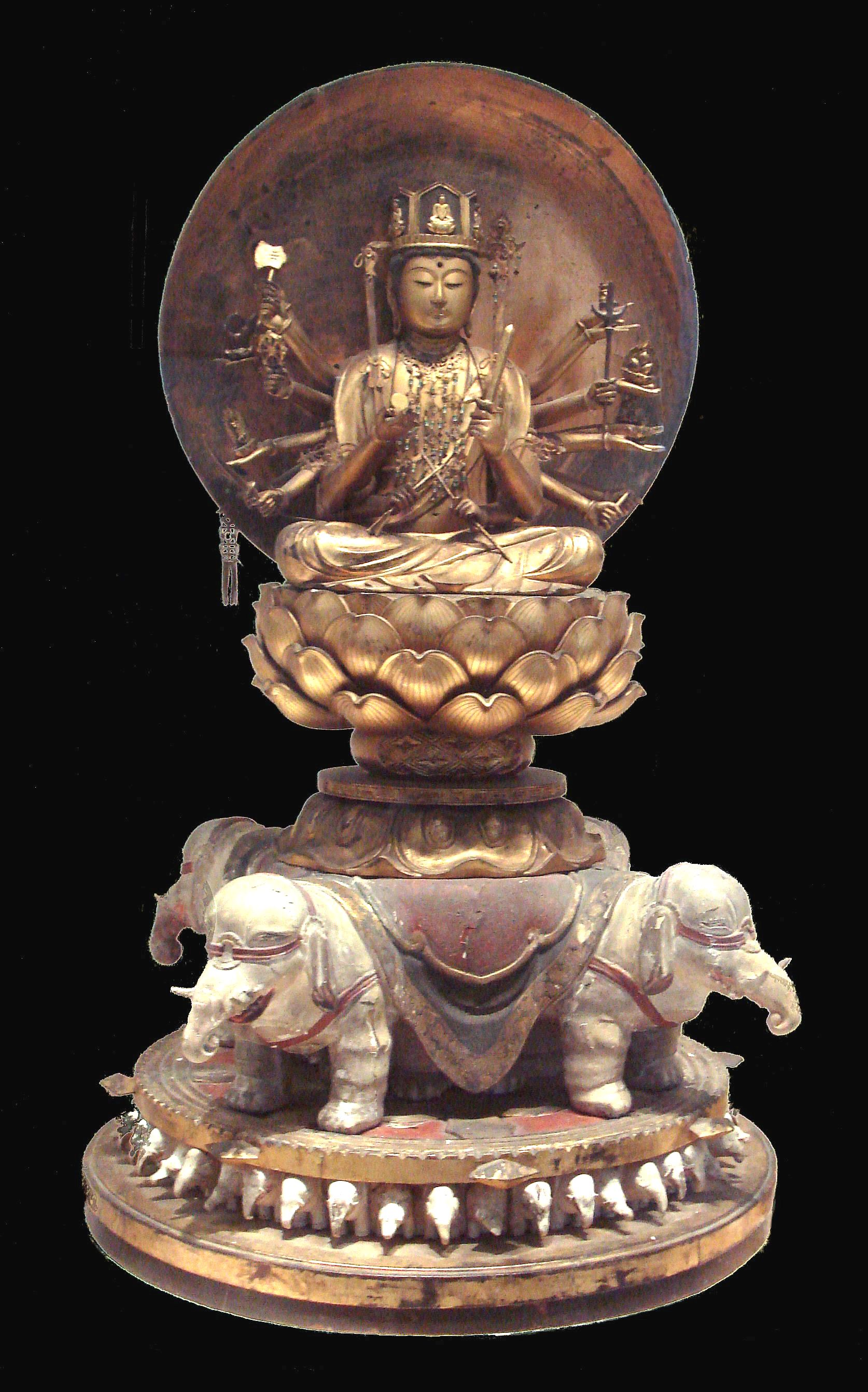 주로 코끼리를 타고 있는 모습으로 묘사되며, 연화대(연꽃) 위에 앉은 모습은 주로 진언밀교 계통에서 만들어진 것으로 알려져 있다.[24]