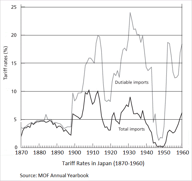 메이지 유신 전후 일본은 1911년 조약 개정까지 관세 자주권이 없었기 때문에 관세 수입은 겨우 4~6%에 그쳤고, 세수의 60%에서 92%가 토지세에 의존했다.[157] 당시 일본과 영국의 세수 구조는 전혀 달랐는데, 영국의 세수는 소비세와 관세가 60%, 토지세가 5%였다.[157]메이지 초기부터 제국주의적인 패권 경쟁 속에서 일본의 이익을 어떻게 보호할 것인가를 목적으로 후쿠자와 유키치 등의 논설에서 보호무역이 나타났다.[158] 메이지 중기부터 타구치 우키치와 도쿠토미 소호는 정부의 보호무역 정책을 비판하고 자유무역을 주장했지만, 카와카미 하지메는 농업 중시론을 주장하며 이를 비판했다.