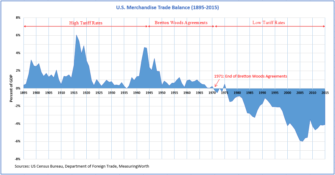 미국의 산업 발전은 보호무역 정책(1816~1848년), 온건한 보호무역(1846~1861년), 엄격한 보호무역(1861~1945년) 시기에 걸쳐 이루어졌다.[38] 19세기 후반에는 미국 임금과 농민 보호를 위해 더 높은 관세가 도입되었다.[39] 1824년부터 1940년대까지 미국의 평균 관세율은 영국 등 다른 유럽 국가보다 훨씬 높았다.[40] 제2차 세계 대전 이전까지 미국은 가장 보호무역적인 경제를 유지했다.[41]