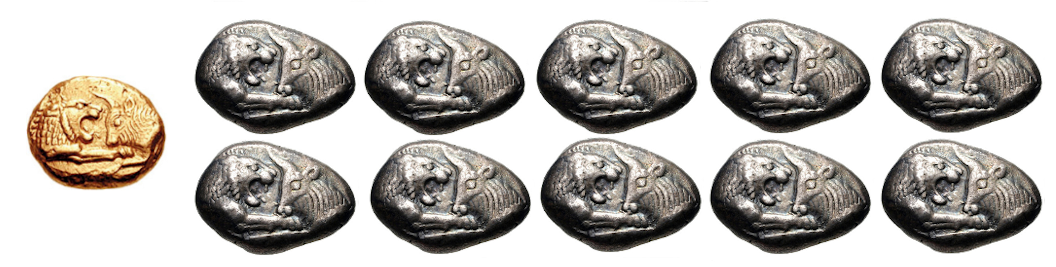 크로이소스는 크로이세드 금화와 은화를 발행하여 금과 은의 가치 비율을 확립하고 복본위제의 초기 형태를 제시했다.