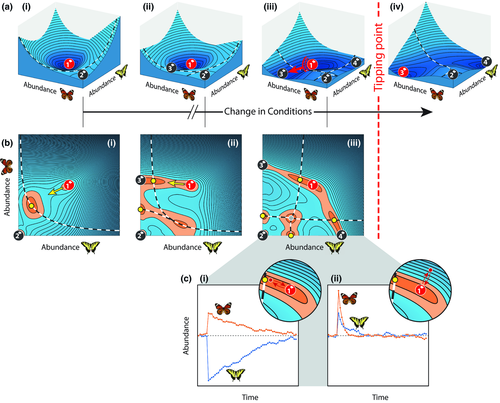 임계 전이는 변화하는 조건이 임계점 또는 분기점을 지날 때 발생할 수 있는 생태계, 기후, 금융 및 경제 시스템 또는 기타 복잡 시스템의 갑작스러운 변화이다.[14][15][16][17] 시스템 상태 공간에서 '임계 감속 방향'은 진동 또는 기타 복잡한 역학을 유발하는 지연된 부정적 피드백이 약할 때 이러한 전이 후 시스템의 미래 상태를 나타낼 수 있다.[13]