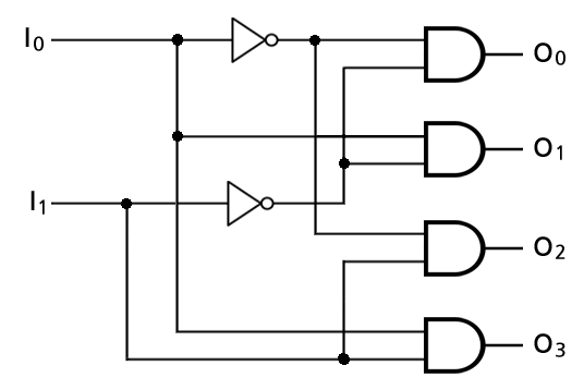 n개의 입력으로 들어오는 데이터를 받아 그것을 숫자로 보고 2영어의 n승 개의 출력 회선 중 그 숫자에 해당되는 번호에만 1을 내보내고, 나머지는 모두 0을 내보내는 논리회로이다.'''2x4 디코더'''는 다음과 같다.