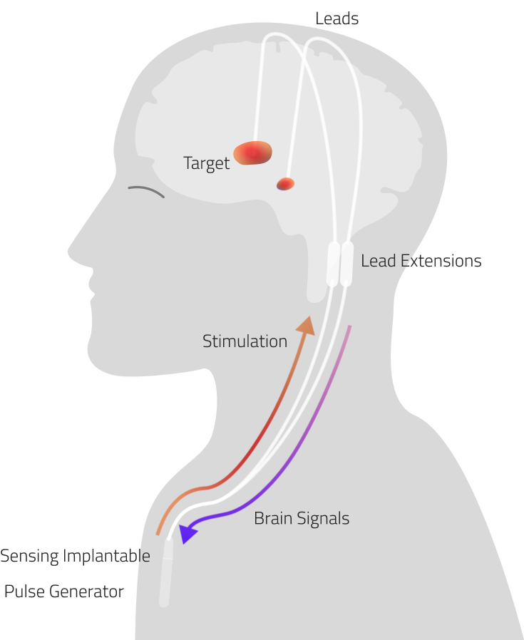 본태성 진전의 또 다른 침습적 수술 치료법은 심부 뇌 자극술(DBS)이다. DBS는 4~8개의 접점을 가진 영구적인 전극을 뇌 속에 삽입하고, 환자의 쇄골 근처에 이식된 펄스 자극기에 연결하는 수술 절차를 포함한다.[67] 진전 치료에서 전극은 시상(thalamus)의 복측 중간 핵(Vim)에 위치한다. 펄스 자극기는 표적 부위에 지속적인 전기 펄스를 전달하여 표적 부위의 활동을 방해하며, 이는 진전 증상을 개선하는 것으로 나타났다.[82] DBS를 이용한 수술적 중재 후 1년 시점에 환자들은 66%의 개선을 보였고, 10년 시점에는 48%의 개선을 보였다.[71] DBS는 본태성 진전의 효과적인 수술 치료법으로 여겨지지만, 임상 시험에서 DBS와 관련된 부작용과 합병증이 보고되었으며, 여기에는 불균형 또는 보행 불안정, 근육 이상 긴장증, 감각 이상, 출혈 등이 포함된다.[70]