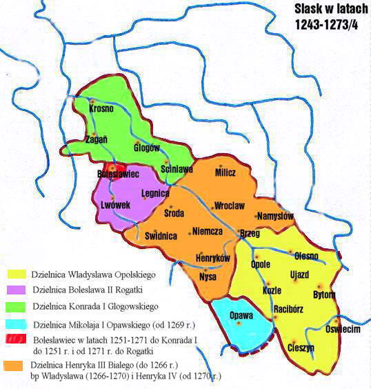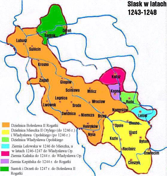 볼레스와프 2세 로가트카는 1241년 레그니차 전투에서 아버지 헨리 2세가 사망한 후 실레지아 공작이 되었다. 그는 몽골의 침략 이후 혼란스러운 상황 속에서 통치를 시작했으며, 주변 공작들과의 경쟁, 특히 대폴란드와 크라쿠프를 둘러싼 갈등으로 어려움을 겪었다. 볼레스와프 2세는 실레지아 공국 분할을 시도하며 동생들과의 갈등을 겪었고, 결국 영토를 분할해야 했다. 그는 브로츠와프 주교와도 갈등을 겪었고, 1270년대에 권력을 아들들에게 넘겨주었다. 그의 통치 기간 동안 실레지아 공국은 분열되었고, 이는 폴란드 왕국 재건 이후 실레지아가 보헤미아에 종속되는 결과를 초래했다.