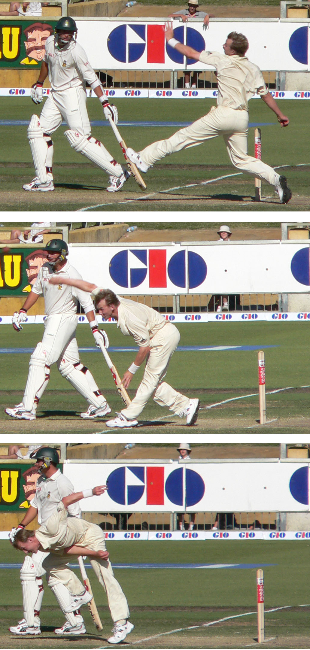 - 프런트온(Front-on) 동작: 뒷발이 피치 아래쪽을 향해 착지하며, 투수는 앞팔 선 안쪽을 바라보며 위켓을 향한다.