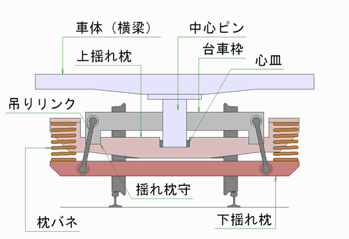 볼스터 앵커(견인력 전달 봉)의 한쪽 끝은 차체에 고정되고, 다른 한 쪽은 대차 프레임에 설치된 크랭크 핀과 결합되어 있다. 좌우 크랭크핀은 로드에 의해 연결되어 있어, 상호 크랭크핀의 작용에 의해 대차는 센터 플레이트를 중심으로 회전하는 듯이 움직일 수 있다.