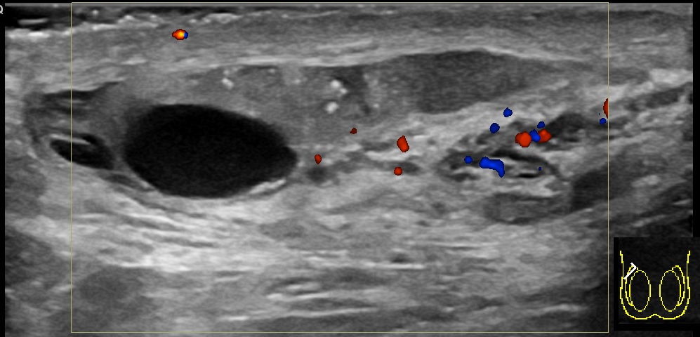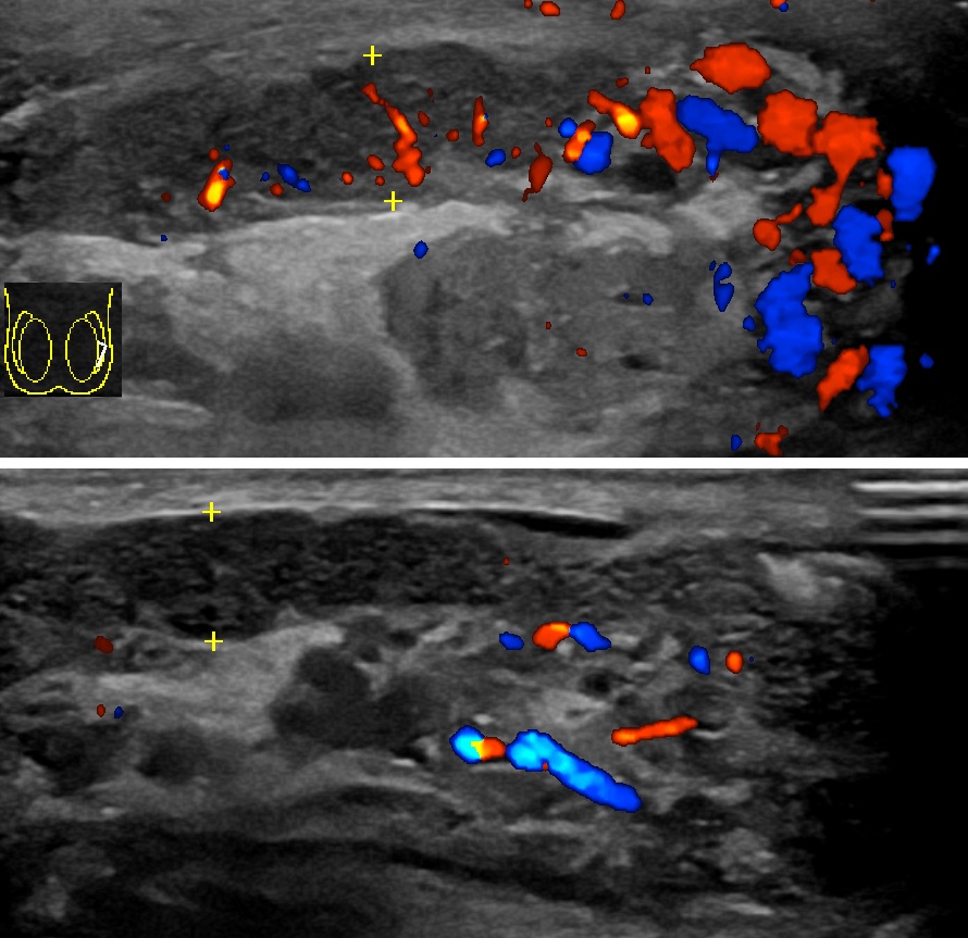 도플러 초음파는 부고환염을 보여주며, 왼쪽 부고환에서 혈류가 실질적으로 증가한 것을 볼 수 있다(상단 이미지). 반면 오른쪽은 정상이다(하단 이미지). 부고환의 두께는 약간 증가했다.