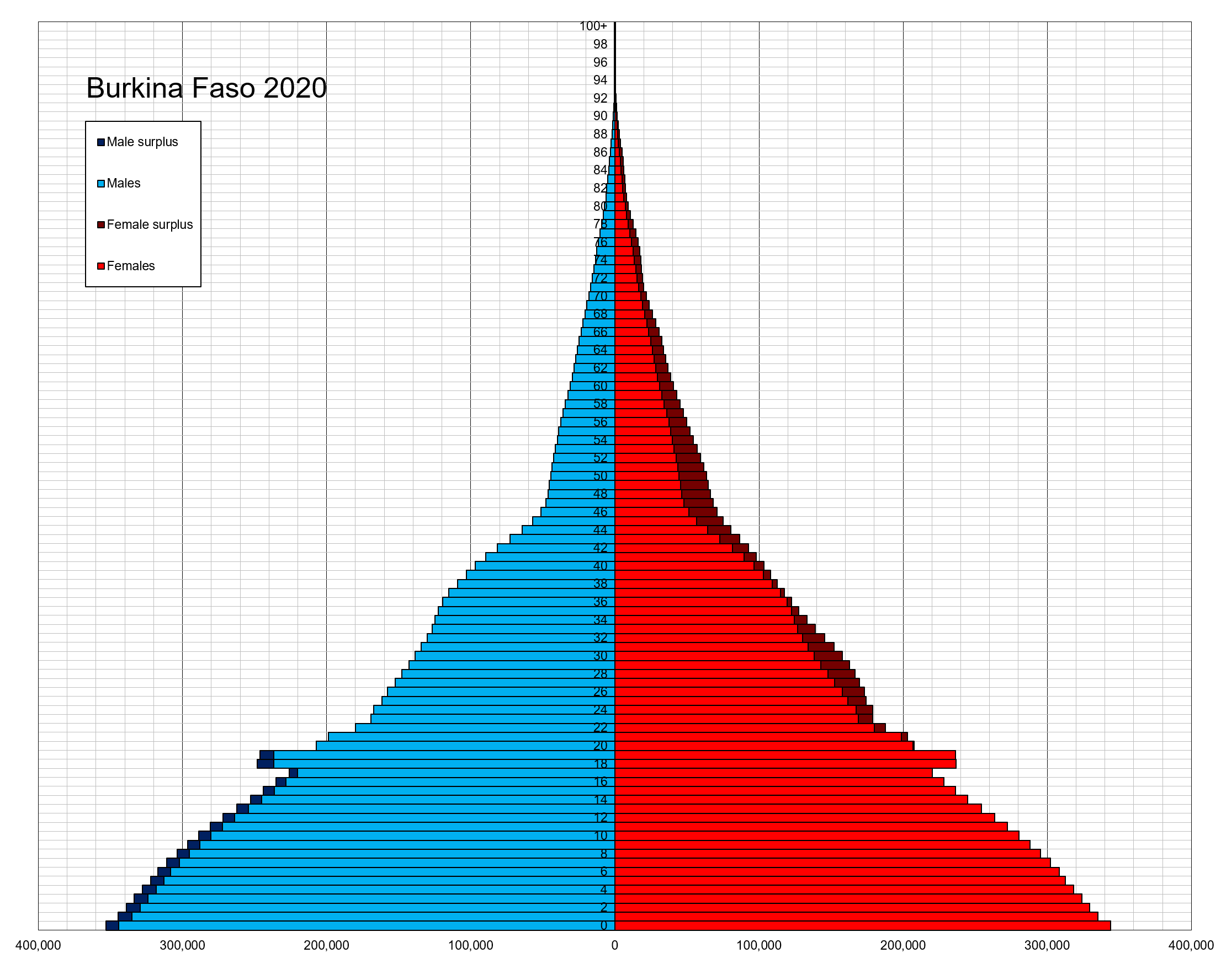 '''2019년 유엔 인구 통계'''에 따르면, 부르키나파소의 총인구는 2030만 명이었다.[17][18] 2020년 기준으로 연령별 인구 구성 비율은 다음과 같다.[1]