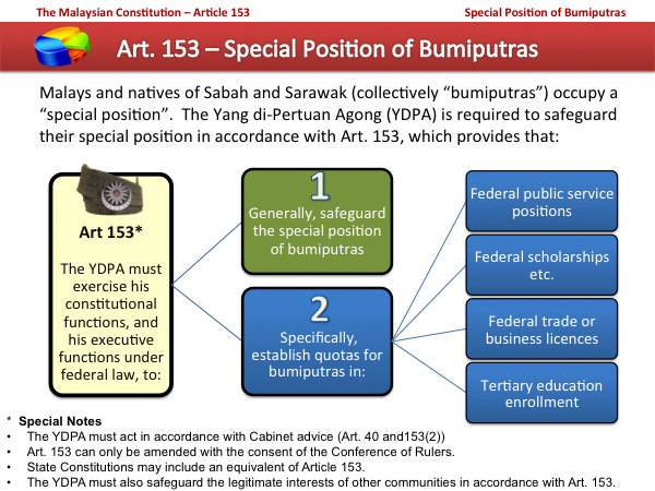 말레이시아 헌법 제153조는 양 디-페르투안 아궁(국왕)이 말레이시아인과 사바, 사라왁 주의 원주민의 특별한 지위와 다른 공동체의 정당한 이익을 보호할 책임을 명시하고 있다. 그러나 헌법 제8조는 모든 말레이시아 시민이 법 앞에 평등하며, 종교, 인종, 혈통 또는 출생지에 근거한 차별을 금지하고 있다.