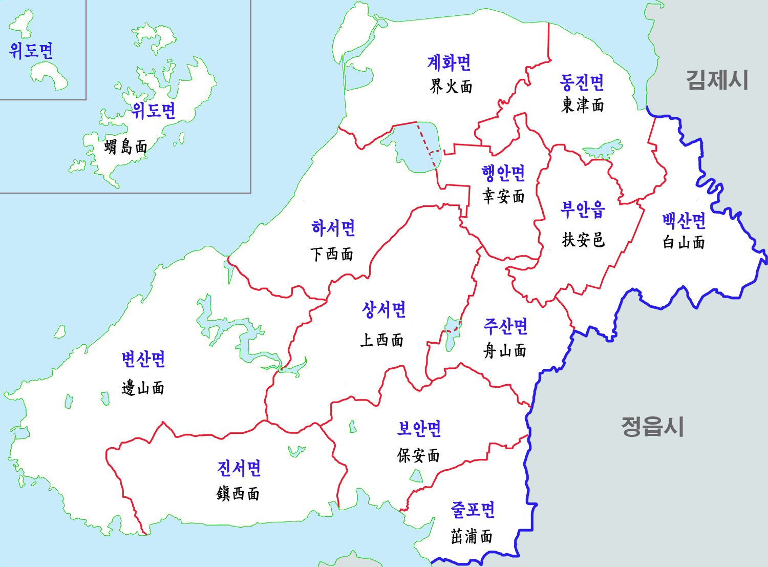 읍면 | 부안읍 주산면 동진면 행안면 계화면 보안면 변산면 진서면 상서면 하서면 백산면 줄포면 |