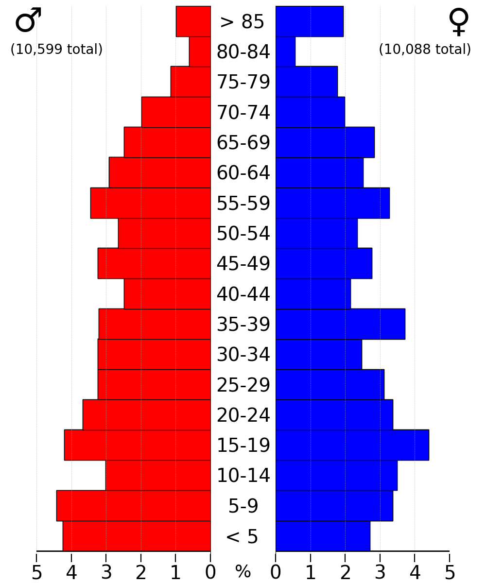 군 전체 인구는 18세 미만이 25.40%, 18세에서 24세가 12.20%, 25세에서 44세가 25.40%, 45세에서 64세가 20.20%, 65세 이상이 16.90%였다. 중앙 연령은 36세였다. 여성 100명당 남성은 100.40명이었다. 18세 이상 여성 100명당 남성은 97.40명이었다.[13]