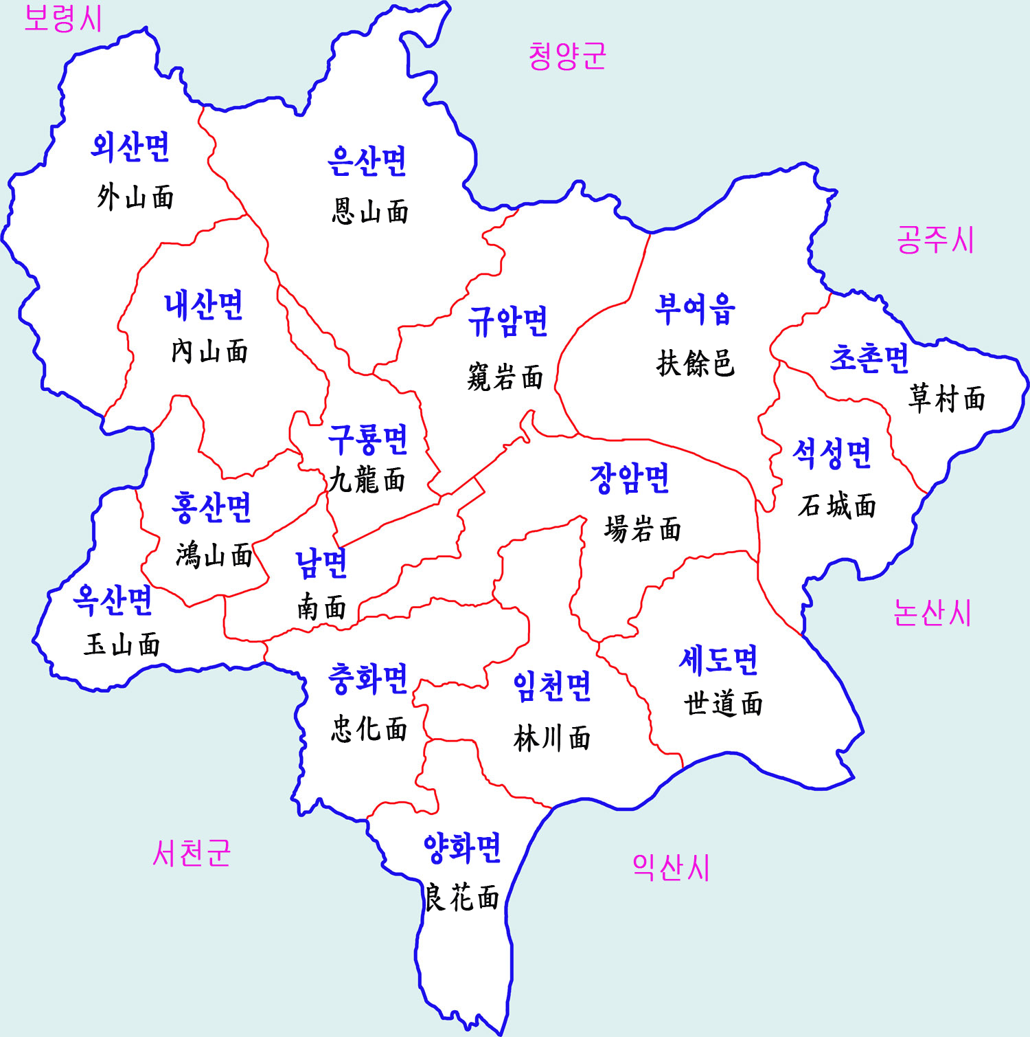 - 현내면, 규암면, 은산면, 초촌면, 충화면, 양화면, 임천면, 장암면, 세도면, 외산면, 내산면, 구룡면, 홍산면, 옥산면, 남면, 석성면